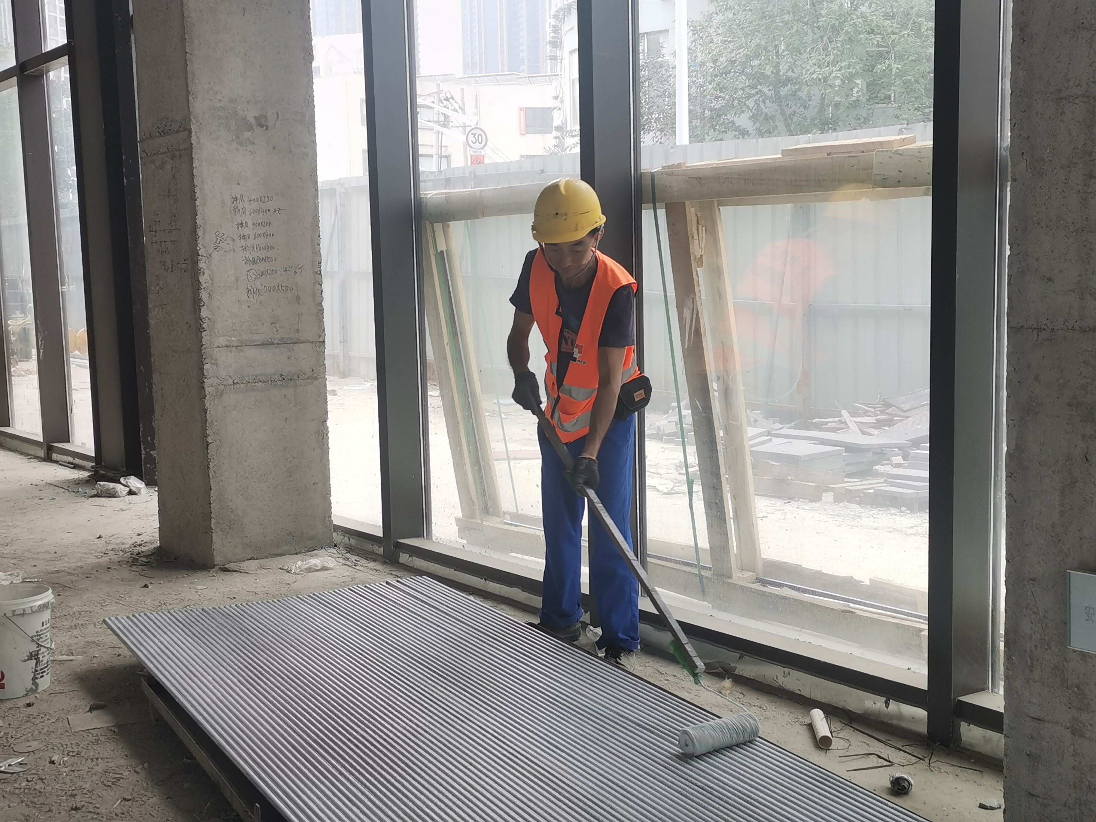不远处另一旁,正在涂刷防火涂料的涂料工张师傅为了保证防火层涂料的均匀覆盖,正甩开臂膀,用滚筒来回涂刷。