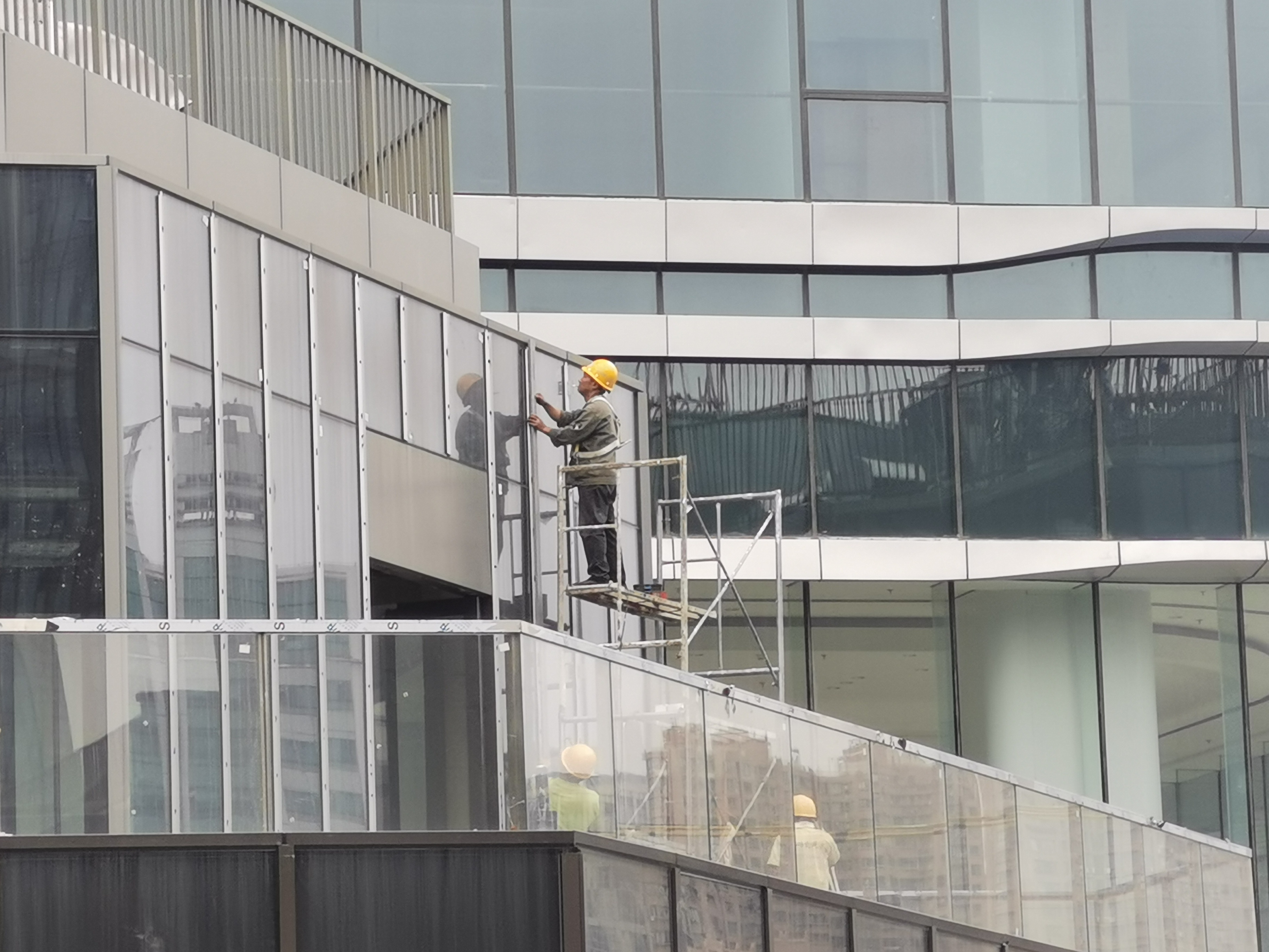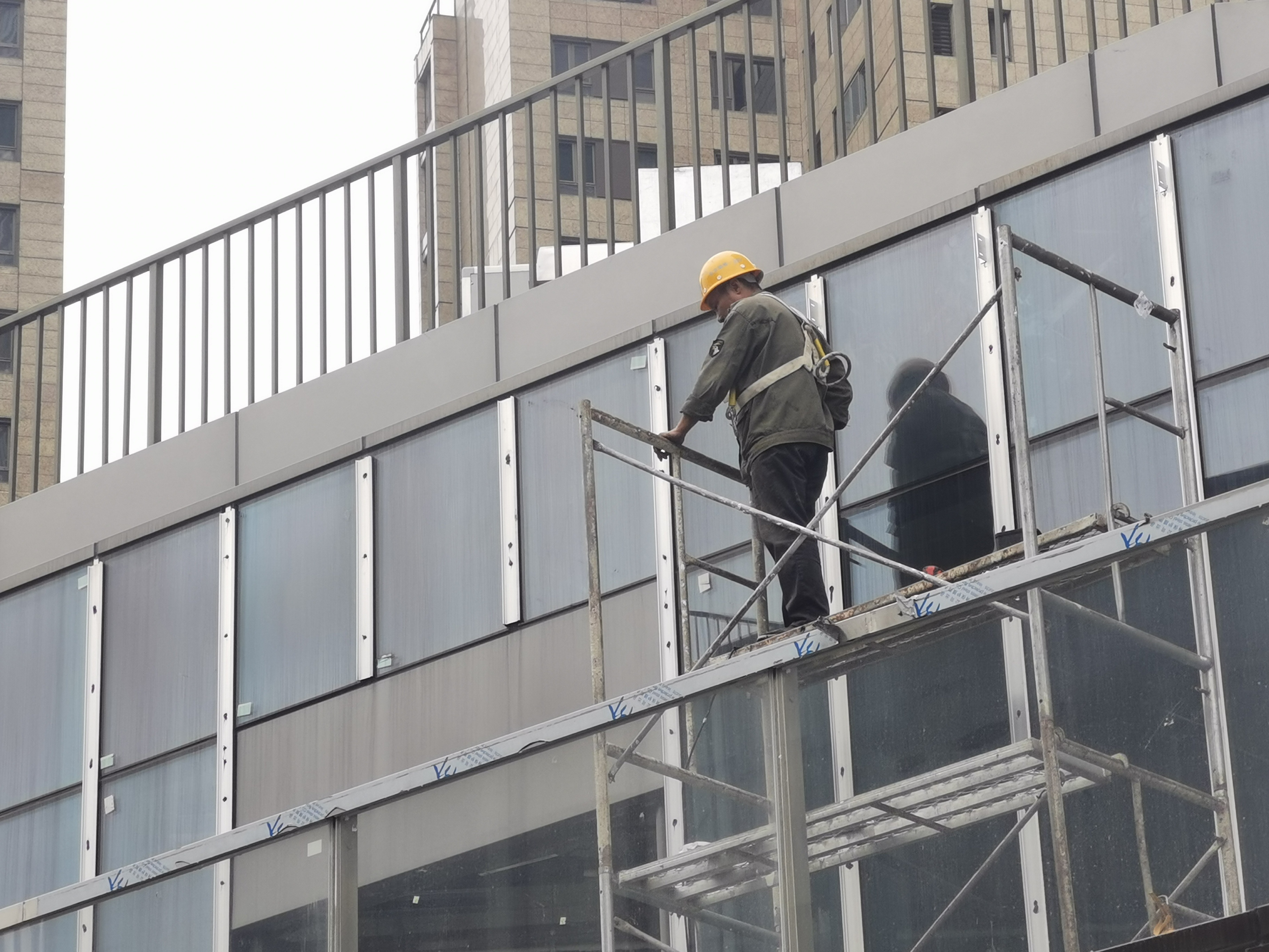 每天爬上脚手架搭成的简易楼梯,来到裙房屋顶作业,这是夏师傅的工作任务。“我做这个工作很多年了,一开始是有点害怕这个高度的,但按规定做好安全措施,系好安全绳,时间久了,这点高度已经不算什么。”
