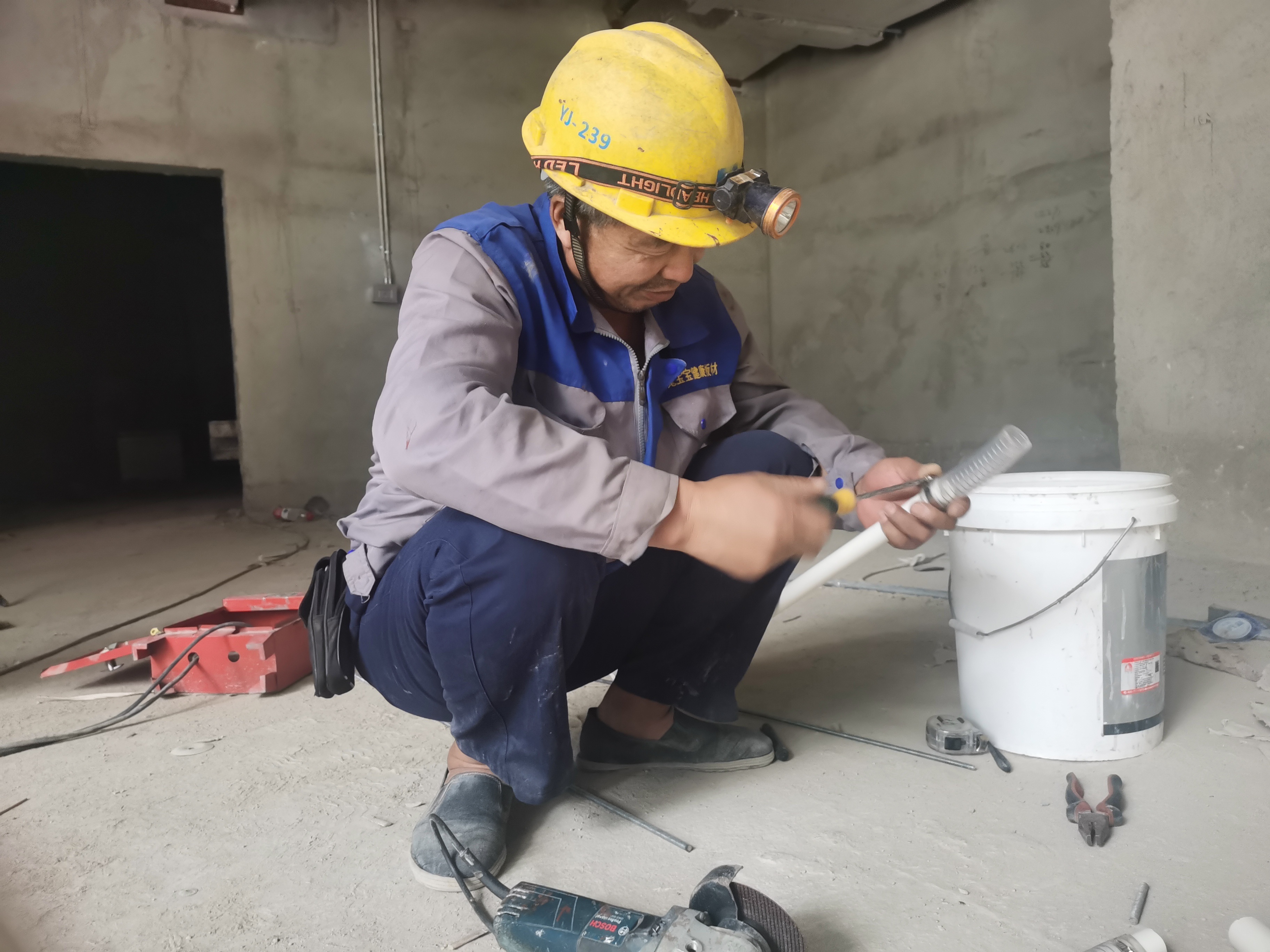 在地下室负四层,水电工王师傅正用电钻疏通下水管道与地漏之间的部分。尽管没有前段时间的高温天气,但地下室依旧闷热,王师傅身上的衣衫早已被汗水打湿。
