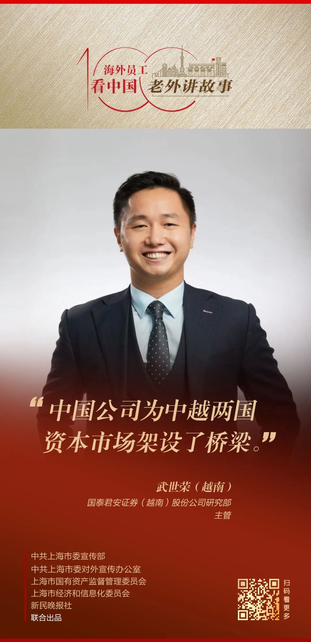 合体的西装,干练的表情,严谨而有逻辑的表述……越南小伙武世荣,浑身散发出金融从业者独有的气质。作为国泰君安证券(越南)股份公司的研究部主管,他凭借专业能力为客户量身定制投资趋势;而作为中国企业里的外籍员工,他也眼光精准地看到了中国市场的机遇与潜力。