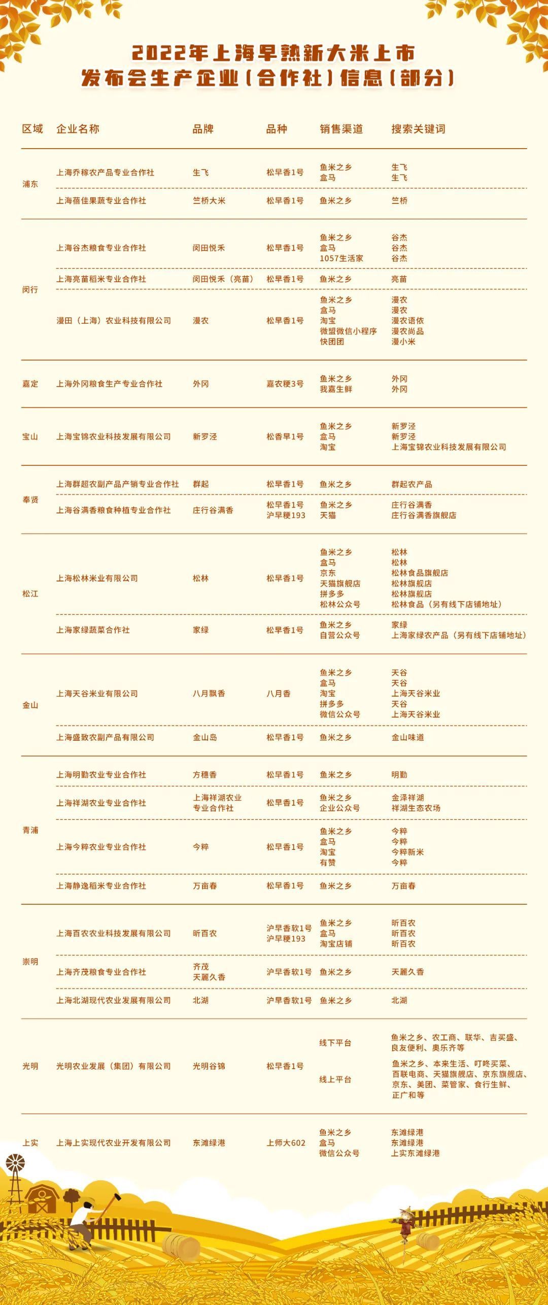 那么 ,新米在哪里能买到呢?据了解,来自上海市9个涉农区的22家大米生产主体参与2022年上海早熟新大米市场营销及宣传推介活动。活动统一采取线上与线下相结合的售卖模式,在上海市农产品公共服务平台——鱼米之乡以及盒马鲜生两个平台重点推介销售。此外,生产主体的自有渠道如淘宝、天猫或微信公众号等也可购买。报名参加活动的新大米,做到全程质量安全可追溯,并在包装袋上明显标注,方便市民放心选购。