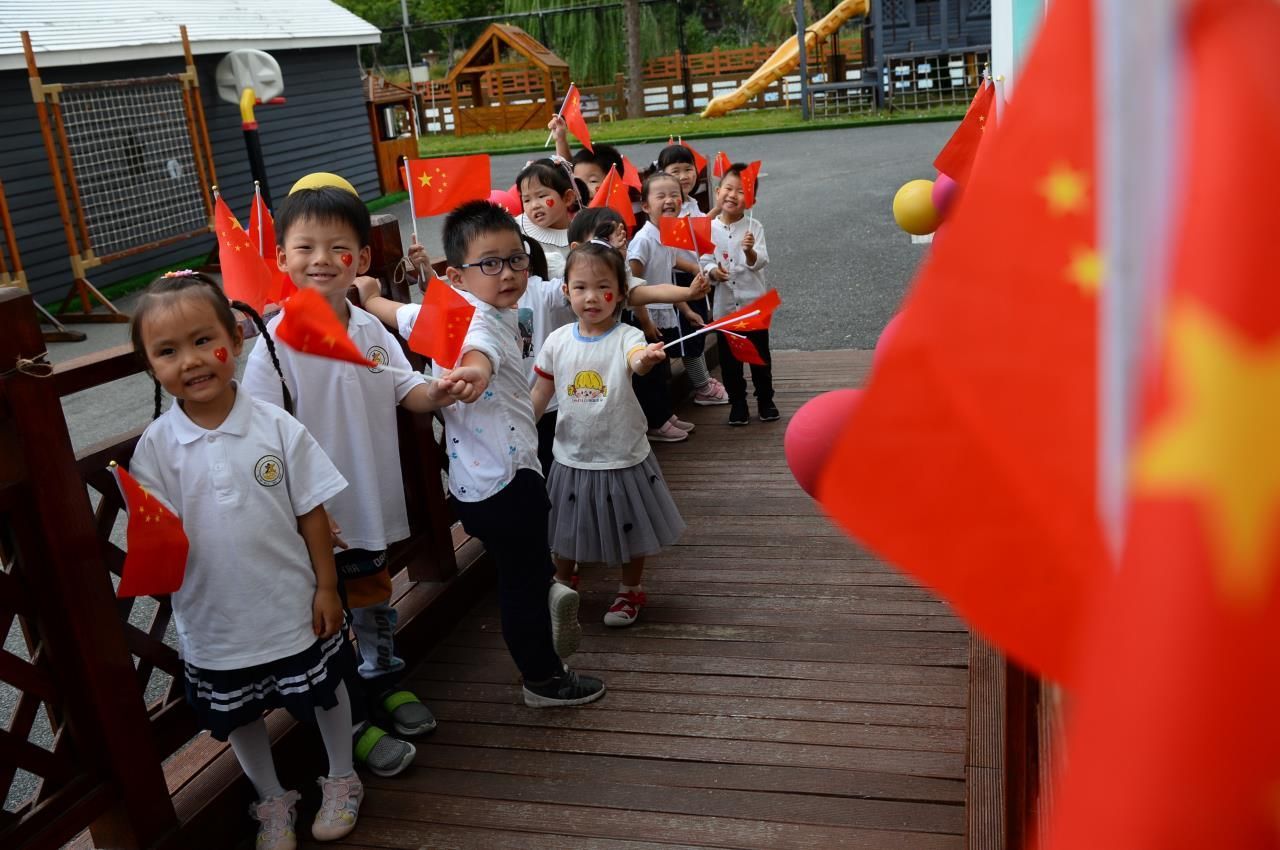 在国庆来临之际,大宁国际第三幼儿园的孩子们或身着红色衣服、或穿上中国传统汉服,兴致勃勃地进入幼儿园参加国庆节系列活动。