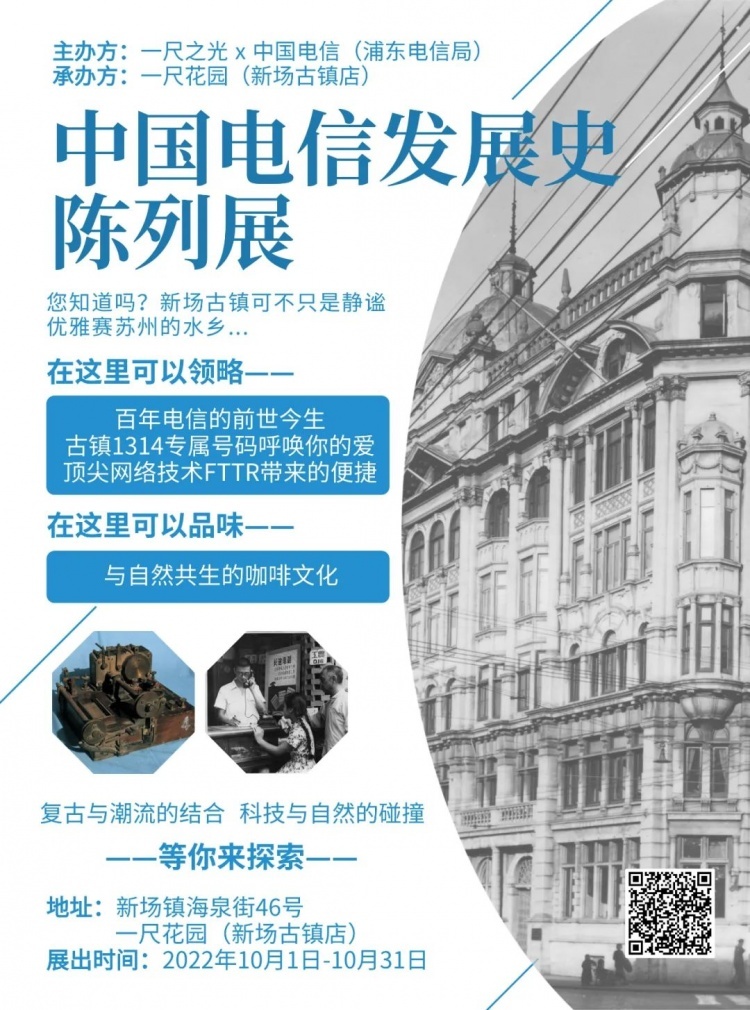 这次的《中国电信发展史陈列展》是浦东电信局的一次全新尝试,这个国庆,欢迎大家在游览风光秀丽的新场古镇时,来一尺花园坐坐,探索中国电信复古与潮流的双重魅力。
