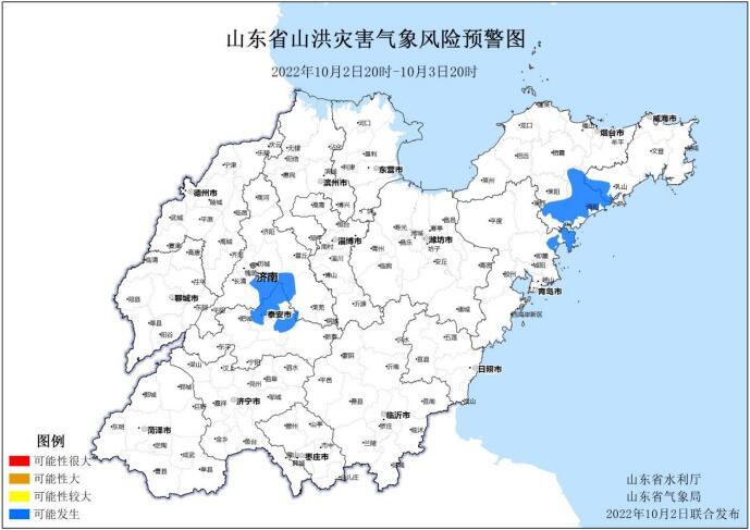 山东省水利厅和山东省气象局10月2日联合发布山洪灾害气象预警:预计10月2日20时至10月3日20时,济南、泰安、青岛、烟台、威海等市局部地区可能发生山洪灾害(蓝色预警)。