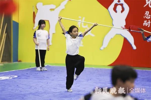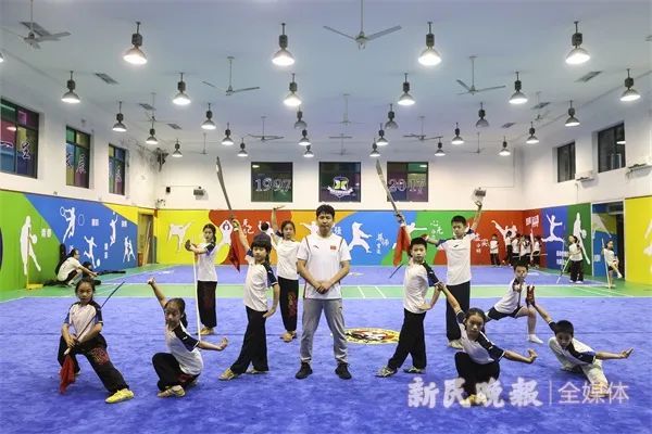 虹口区长青学校的体育馆里,近二十个孩子正在“耍弄”刀枪棍棒,呼呼作响。教练杨世斌站在他们身边,目光如炬,仔细地观察着学生们的动作,时不时地提醒他们,“别松,要到位,训练不能偷懒的!”