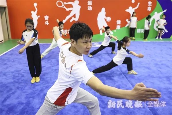 杨世斌是虹口区青少年体育运动学校的武术教练,平常带队就在长青学校训练。出生于“武术之乡”河北沧州的他,自9岁便开始习武,11岁正式成为武术专业运动员,2003年作为人才引进来到上海。2012年因伤退役之后,他选择了留在虹口,成为一名基层武术教练。