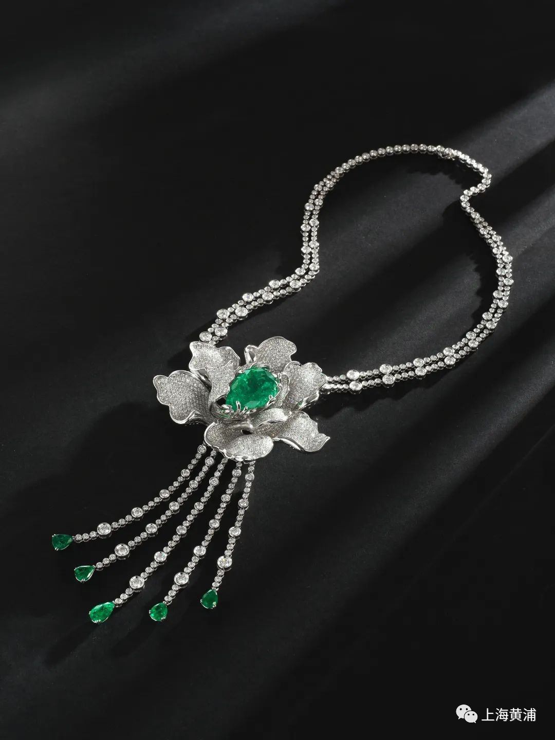 国家级非物质文化遗产——老凤祥金银细工技艺成为这件作品强大的工艺支撑,婀娜多姿的花瓣在极致匠心的打磨中逐渐绽放,清新典雅,纯粹美好;写意了花瓣的数量,却恰到好处地呈现出华丽大气的节奏和风格;钻石镶嵌部分运用了现代密镶工艺,细密流畅地呈现花瓣舒展的流线,光影闪烁如晨露方沁,又似星光闪烁。端妍华贵,倾国倾城,只道是春风拂槛露华浓……