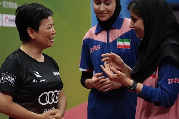 倪夏莲(左)在赛场与比赛对手、伊朗队员交流