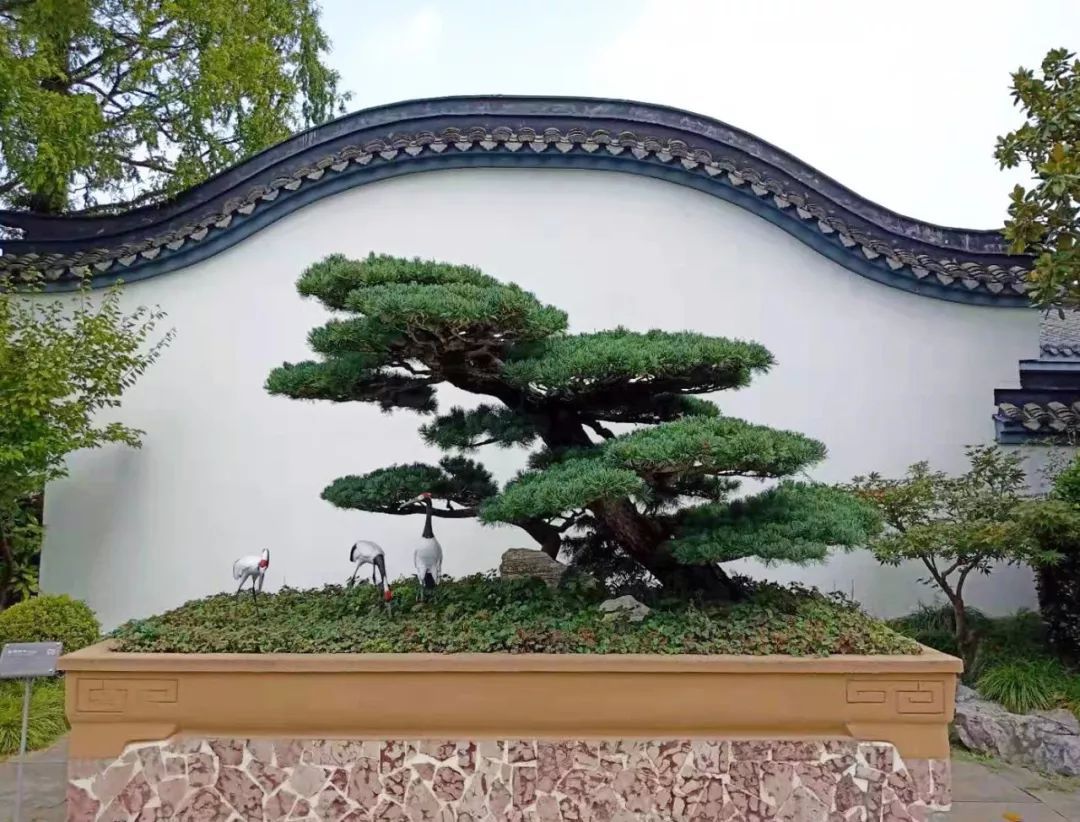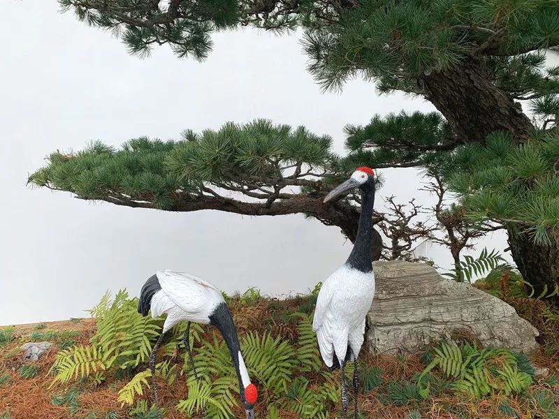 盆景中苍松白鹤,互相呼应
