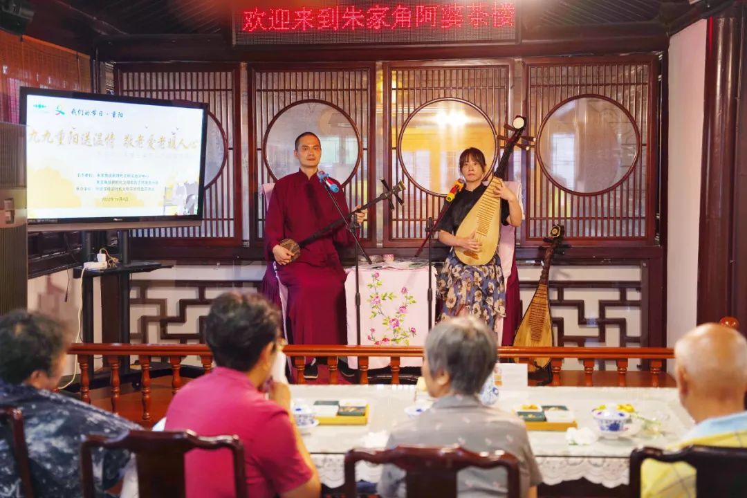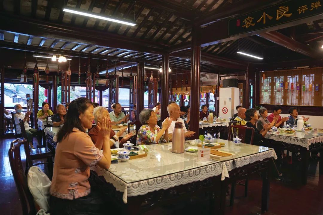 吴侬软语、呖呖莺声……伴着熟悉的叮咚琵琶声,老人们品尝着刚出锅的糕点,高亢的张调、柔柔糯糯的丽调、香甜软糯的重阳糕都让在座老人们印象深刻。评弹老师声情并茂的演绎,使台下的老人们听得入了迷,大家连连称好,掌声不断。