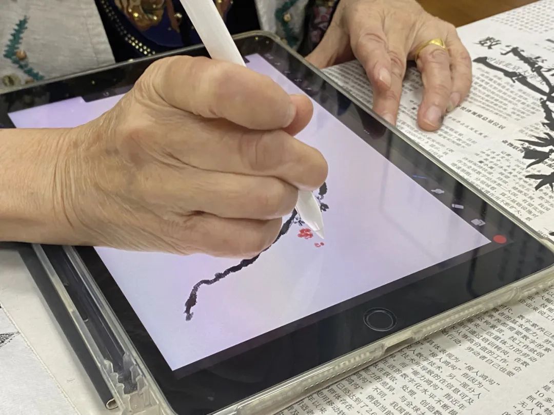 今年84岁的吴汉卿平日里喜欢写写画画,但随着年纪越来越大,握毛笔时会手抖,没法再体验笔墨之趣。在小姚的帮助下,吴奶奶抓着电子笔在平板电脑上随意切换色彩和笔触,画起了梅花。