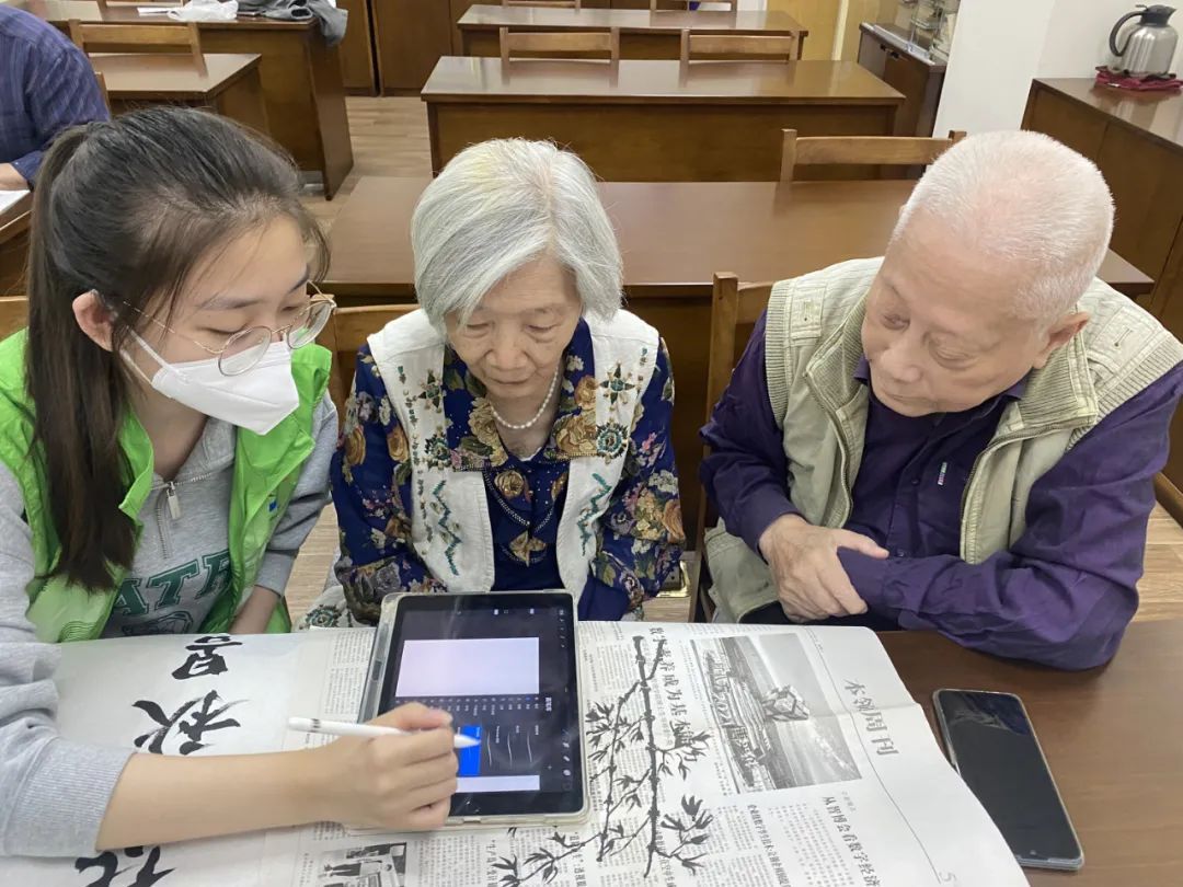 在安亭社会福利院,老人们齐聚一堂。志愿者姚奕奕是00后,也是一位平板电脑绘画爱好者,她正手把手教老人使用新式“绘画工具”,“我的爷爷奶奶早就已经学会了,这里的老人也很感兴趣,学起来很快!”