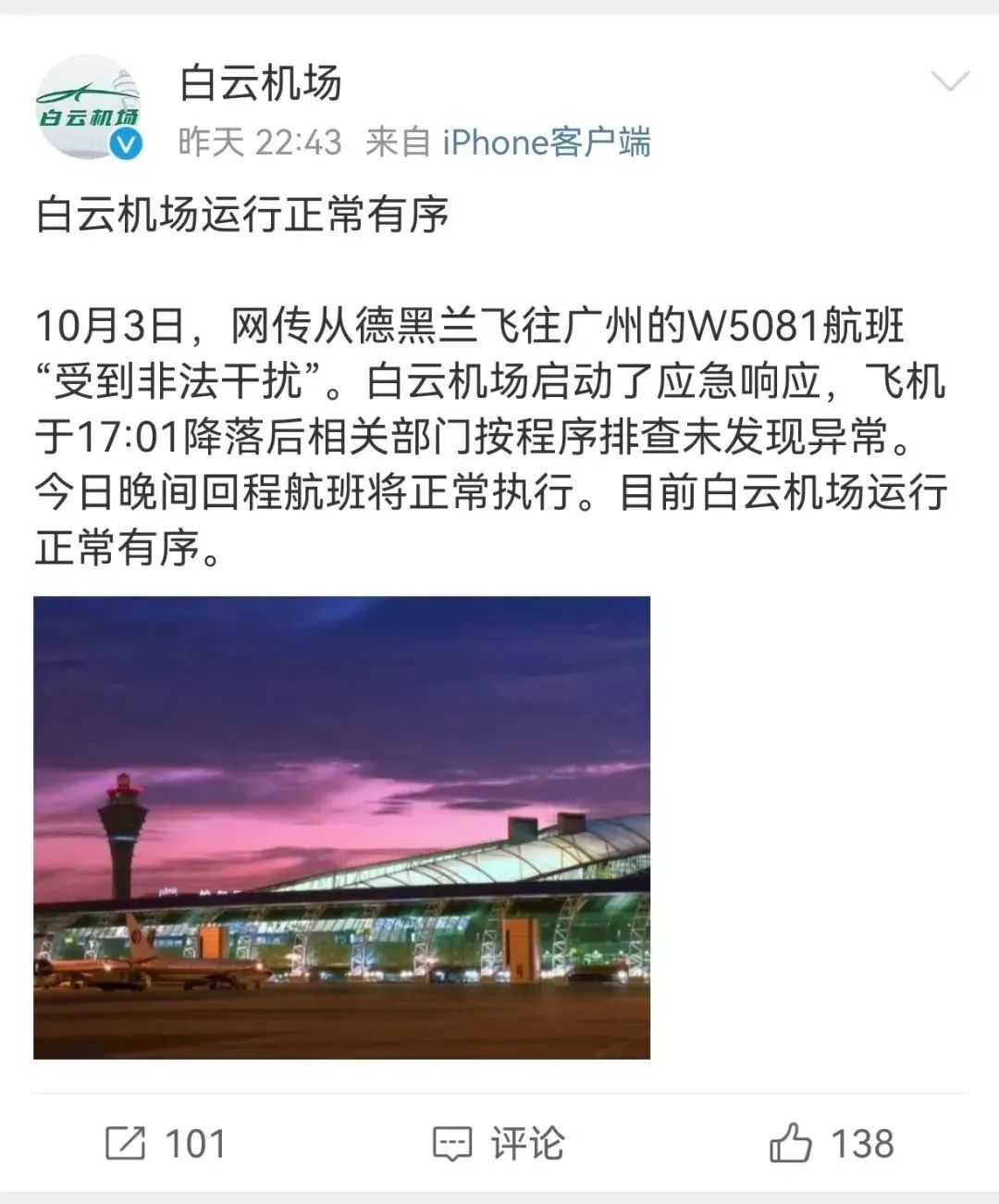 10月3日晚,广州白云机场微博发文称:10月3日,网传从德黑兰飞往广州的W5081航班“受到非法干扰”。白云机场启动了应急响应,飞机于17:01降落后相关部门按程序排查未发现异常。当日晚间回程航班将正常执行。目前白云机场运行正常有序。