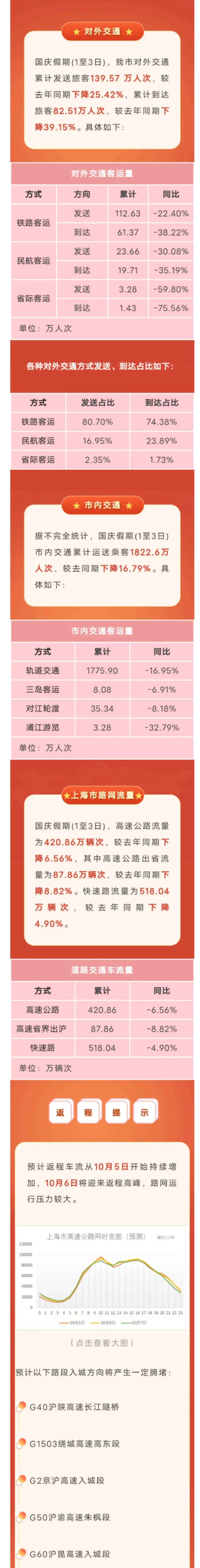 市交通委指挥中心、市公安局交警总队介绍,据不完全统计,国庆假期(1至3日)上海市内交通累计运送乘客1822.6万人次,较去同期下降16.79%。预计返程车流从10月5日开始持续增加,10月6日将迎来返程高峰,路网运行压力较大。即将返程的朋友,别错过这份指南。