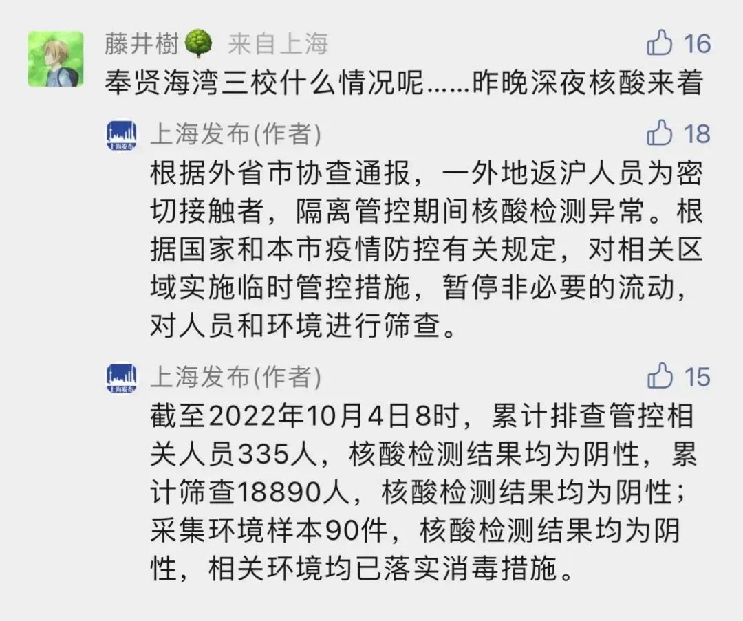 在上海发布的留言区,有网友提问:奉贤海湾的三所学校10月3日深夜核酸什么情况?对此,上海发布回应:根据外省市协查通报,一外地返沪人员为密切接触者,隔离管控期间核酸检测异常。