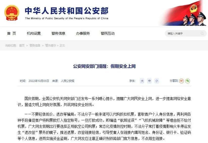 国庆假期,全国公安机关网安部门发布一系列暖心提示,提醒广大网民安全上网,进一步提高网络安全意识,营造文明上网良好氛围,共筑网络安全防线。一旦遭受不法侵害,记得及时截图,留存相关证据并报警。