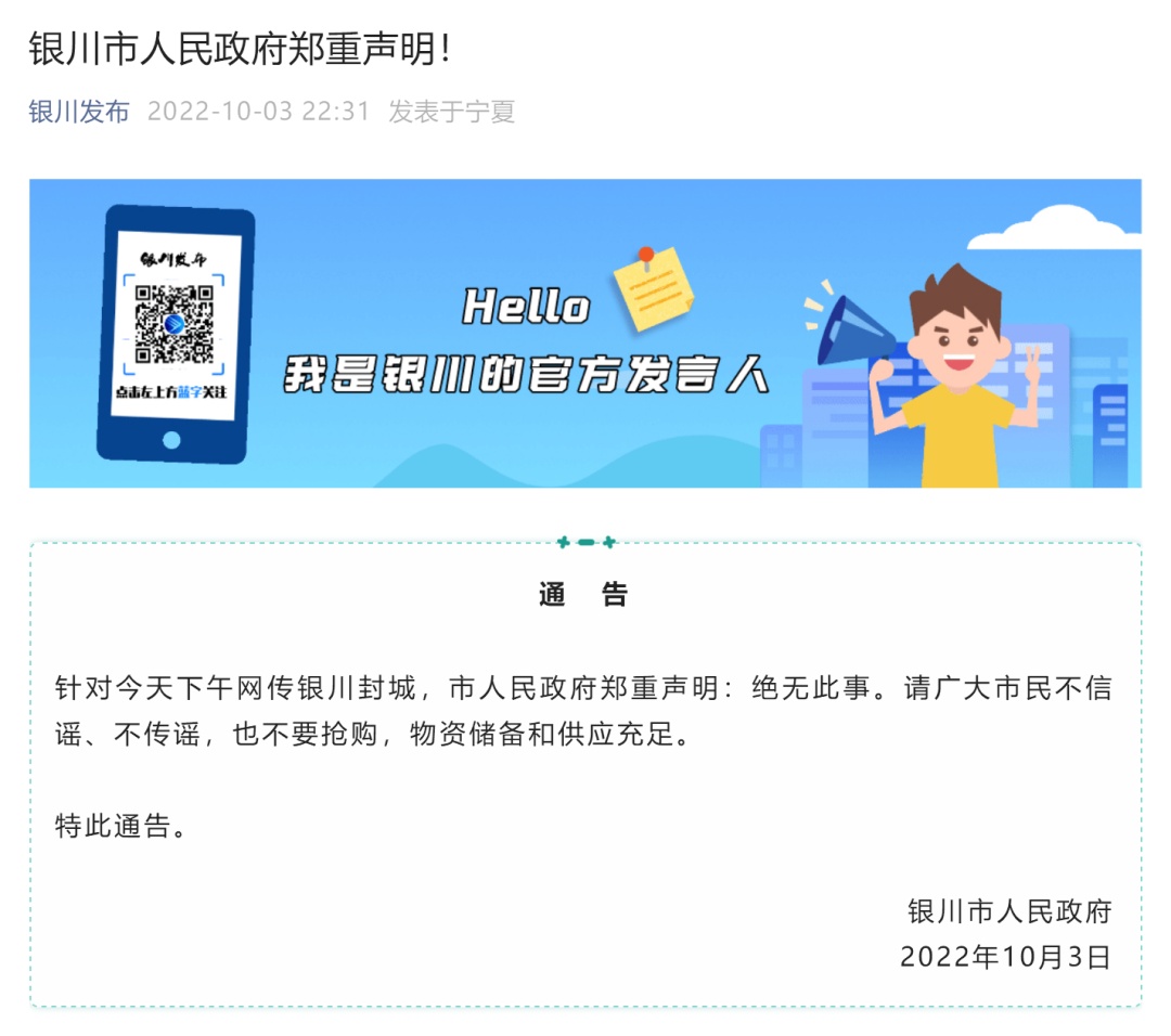 另据消息,有流言称:宁夏银川市将封城。对此,宁夏银川市人民政府10月3日发布通告称:绝无此事!