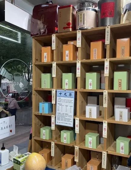 据了解,店内还设置了一处茶叶展示架,其中刚好20个格子,因店主讲究“饭八茶七”,也就是吃饭只吃八分饱,倒茶七分即为满,做事都留有余地,所以在展示架中只放置了19种茶,因此也将这处茶叶展示架称作是十九茶阁。