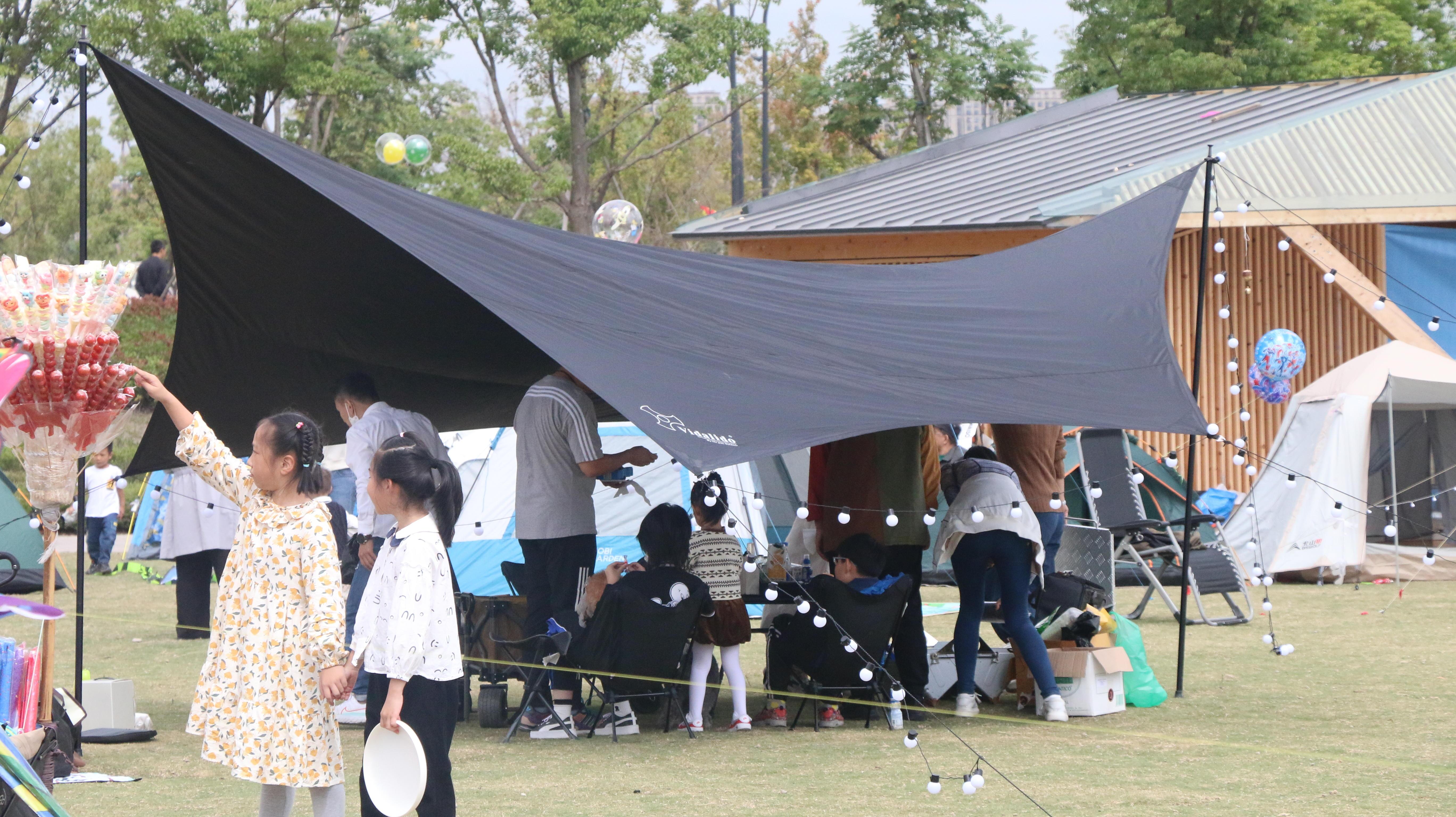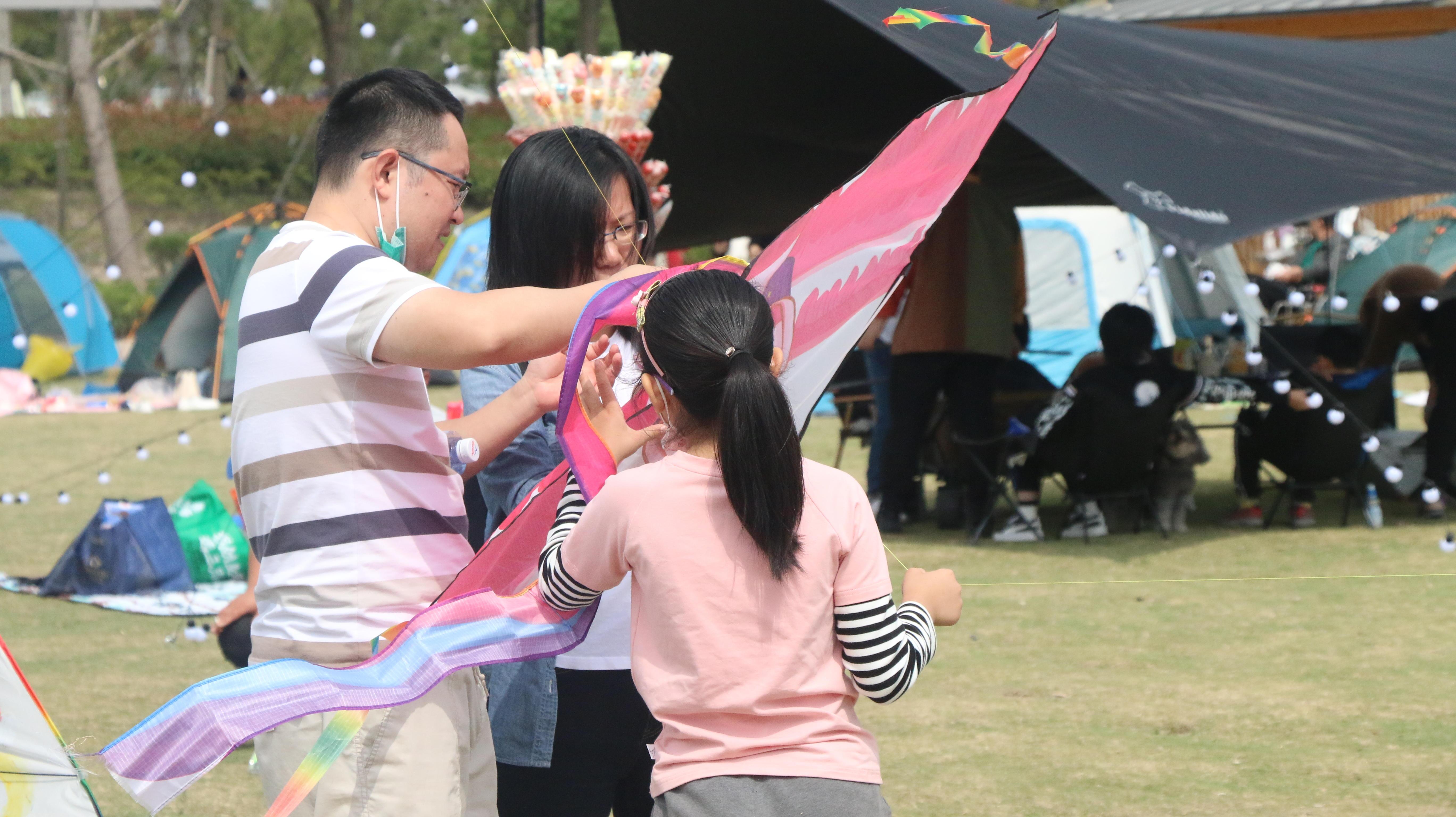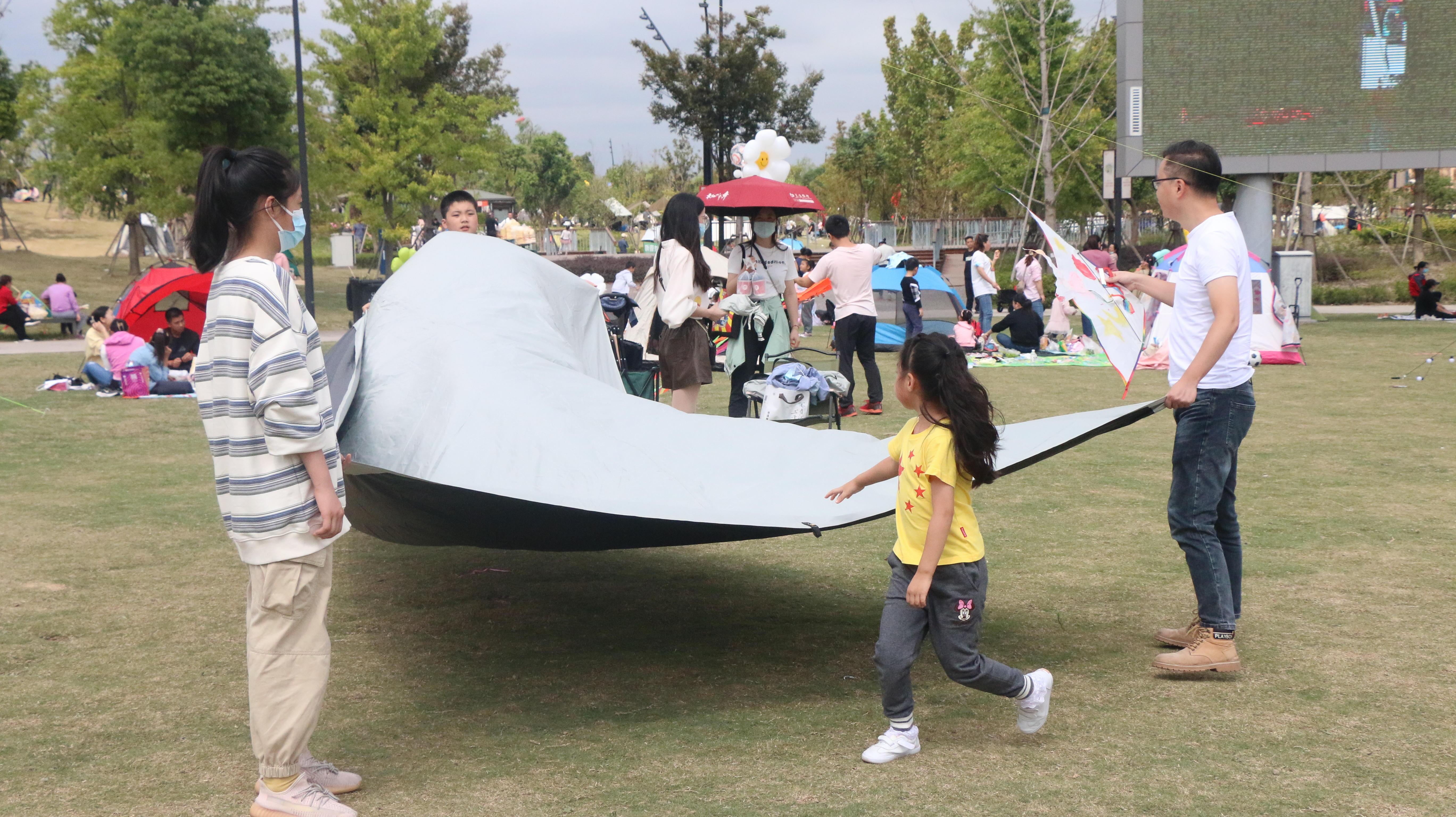 在青年艺术公园大草坪上,不少市民在这里扎帐篷、野餐,其乐融融。空地上,孩子们不亦乐乎地和家长玩传球游戏、放风筝,全家老少齐上阵,享受浓浓的节日色彩和幸福味道。