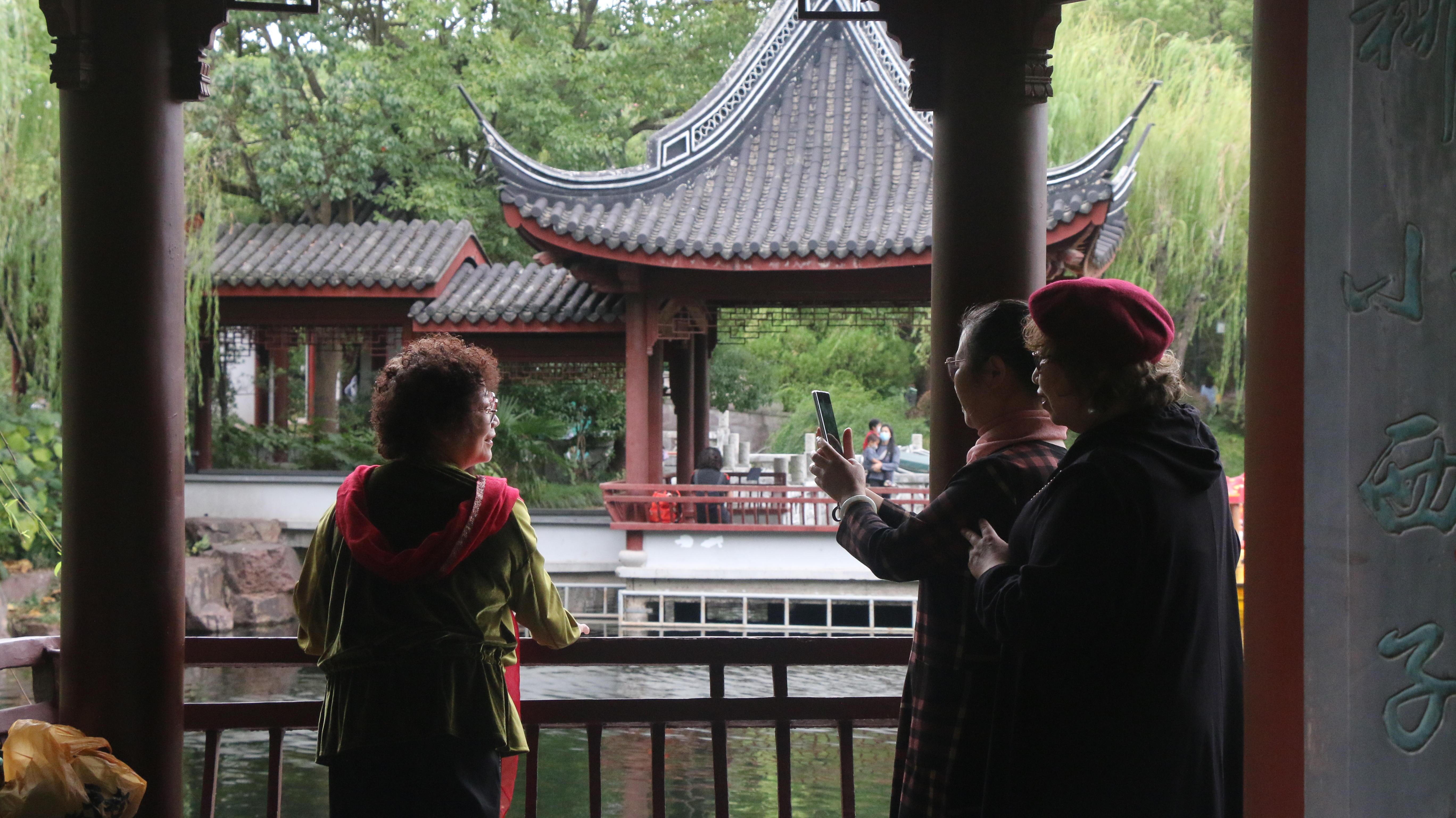 上午9时许,在南桥老城区的古华公园内,一些“远道而来”的游客们正在闲庭漫步,拍照打卡,园内小桥流水、亭台楼阁,一派古色古香的江南韵味,让市民流连忘返。“我们从静安区过来的,早上七点多就出来了。”“这里的绿化非常好,空气非常清新,一走进来,令人心旷神怡。”第一批进园的游客高兴地说道。