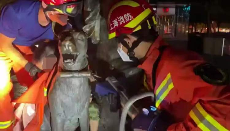 当晚,在广富林街道三湘财富广场,一名5岁左右的小男孩与小伙伴一起玩耍时不慎将左腿卡入喷泉池内两个雕塑的夹缝之中。“一闪神儿就看见孩子骑在狗雕塑上面,腿被卡在里头不能动,一动就痛得止不住大哭,当时真的是急坏了!”孩子的外婆告诉记者,由于夹缝十分狭窄,又恰好卡到关节处,孩子的脚动弹不得,束手无策的她赶忙向消防部门求助。
