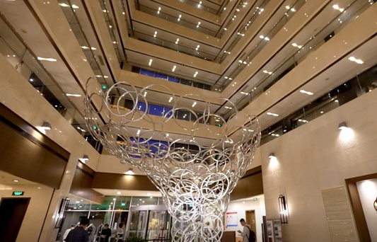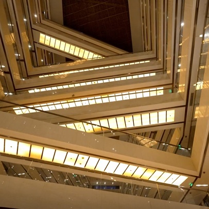 步入酒店,大堂借用纽约大都会博物馆"中庭"的设计理念,至今看来,依旧让人眼前一亮,纵横交错的回廊和天桥浮现眼前,颇为壮观!