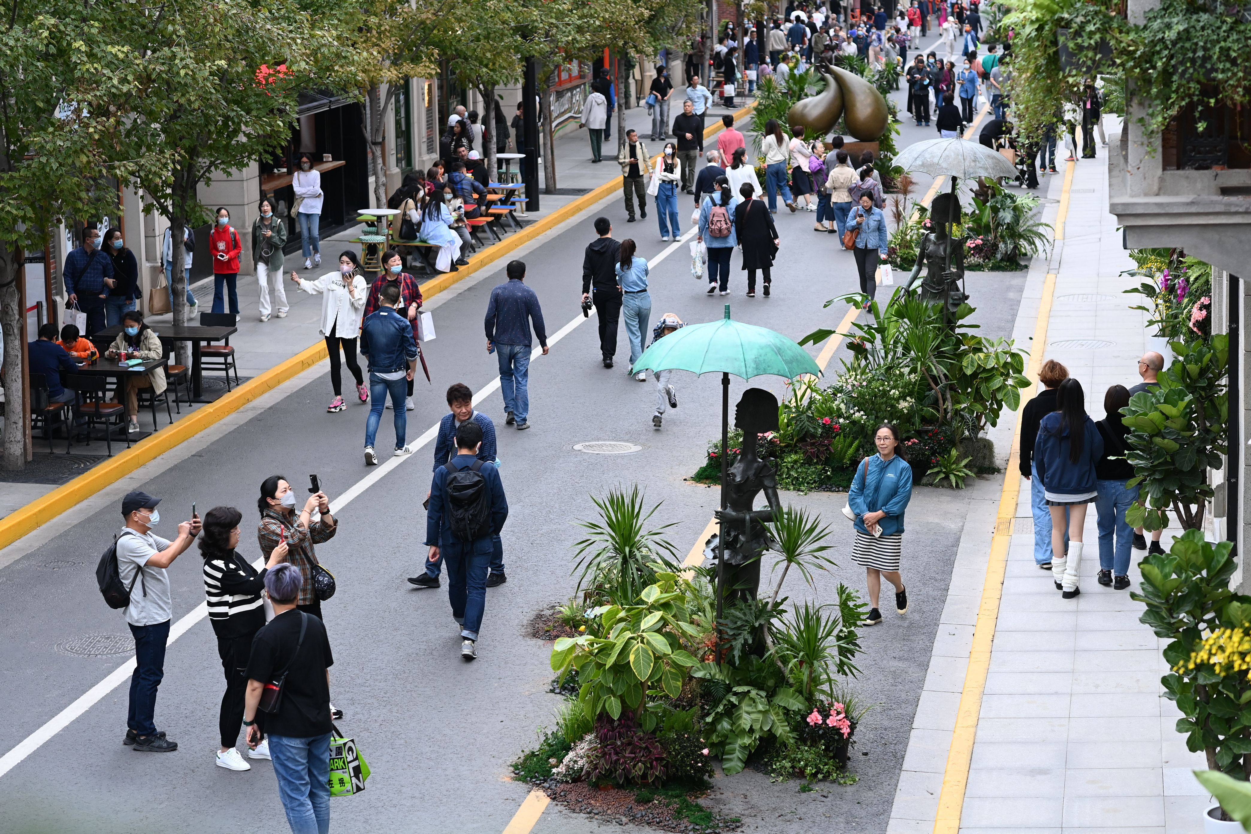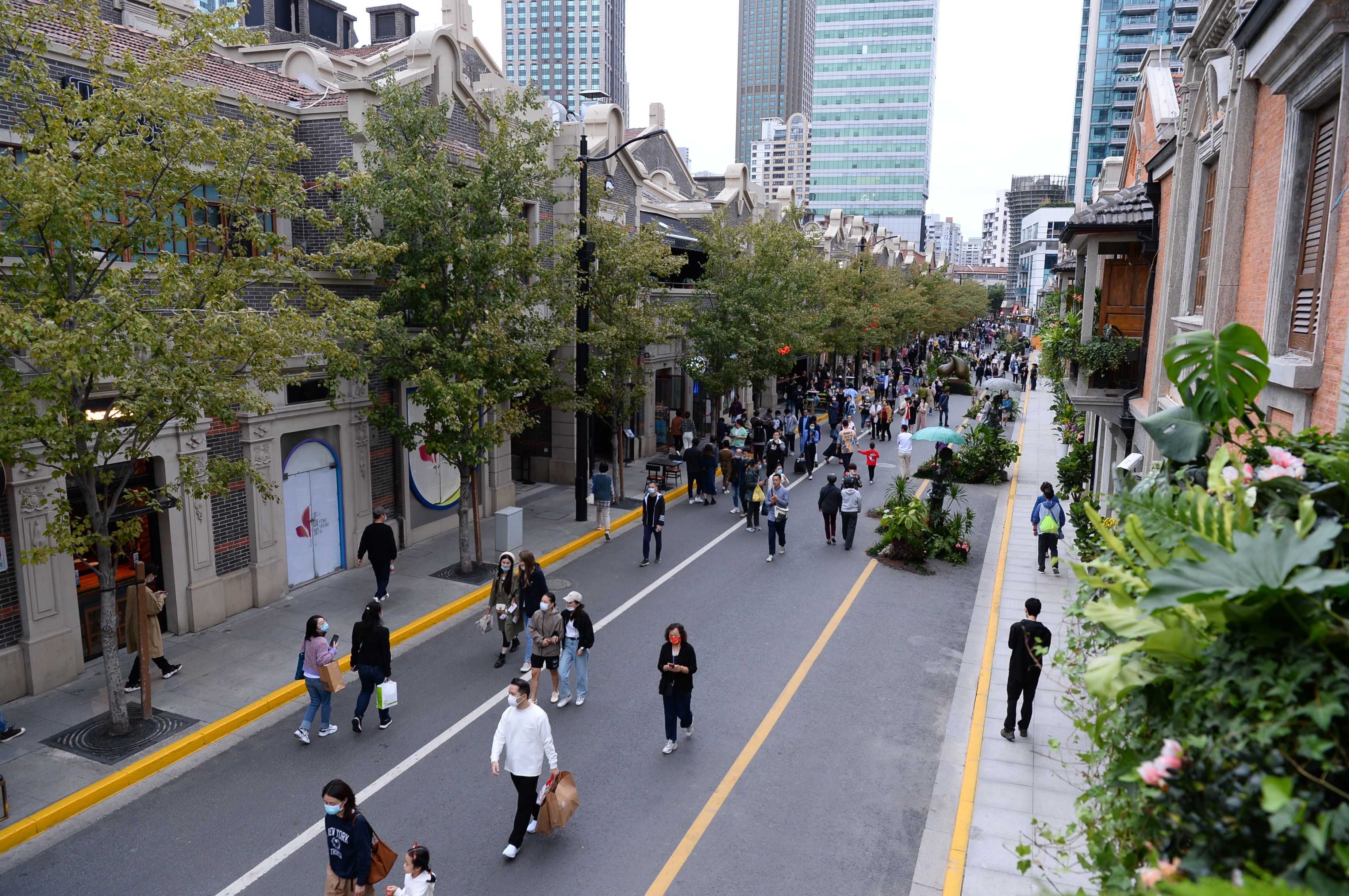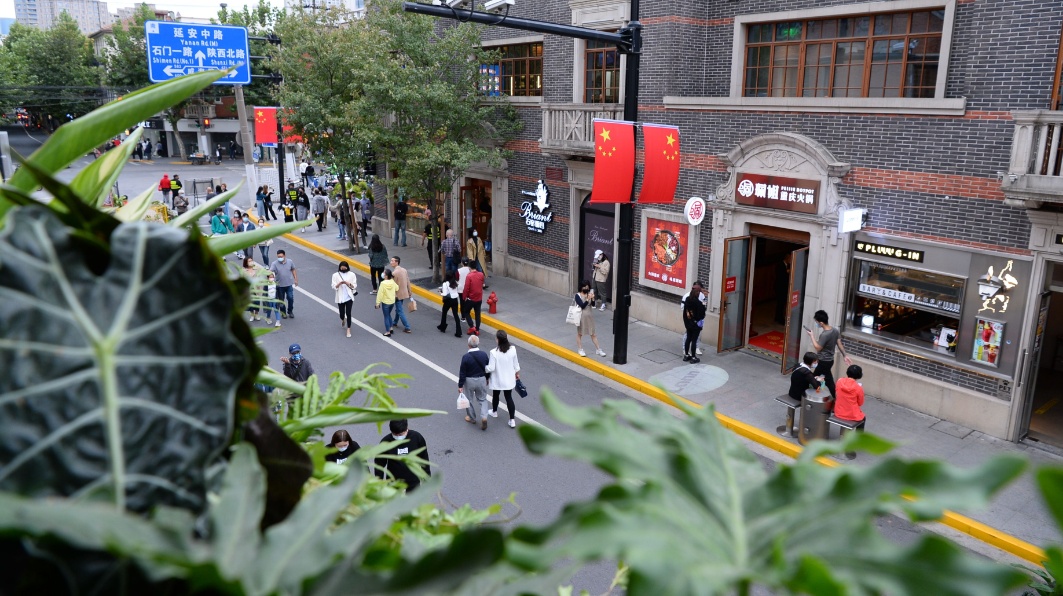 △今年九月下旬,静安区茂名北路限时步行街正式亮相。这个国庆假期,是它陪伴市民游客度过的第一个长假。环境好,人气旺,是人们来这里最直观的感受。