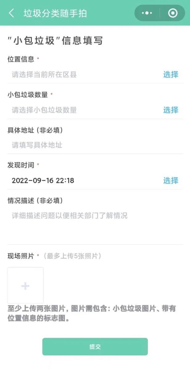 进入小程序——点击垃圾分类随手拍——选择所在区和街镇——选择小包垃圾数量——填写具体小区名称或地址(非必填)——选择发现时间——填写简单情况描述(非必填)——上传小包垃圾照片(至少上传2张,至多上传5张,图片需包括小包垃圾图片、带有位置信息的图片,如小区大门照片或其他可表明所在小区的照片)——提交。