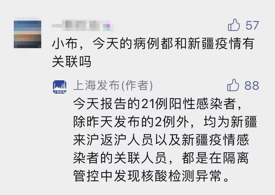 @上海发布 在评论区回应:今天报告的21例阳性感染者,除昨天发布的2例外,均为新疆来沪返沪人员以及新疆疫情感染者的关联人员,都是在隔离管控中发现核酸检测异常。