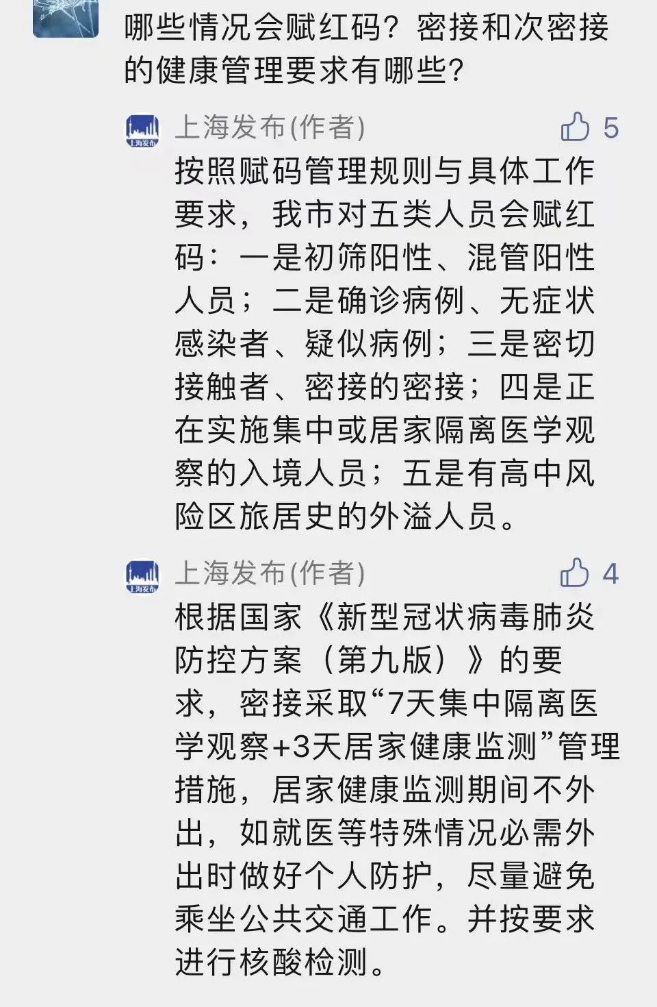 按照赋码管理规则与具体工作要求,上海对五类人员会赋红码:一是初筛阳性、混管阳性人员;二是确诊病例、无症状感染者、疑似病例;三是密切接触者、密接的密接;四是正在实施集中或居家隔离医学观察的入境人员;五是有高中风险区旅居史的外溢人员。