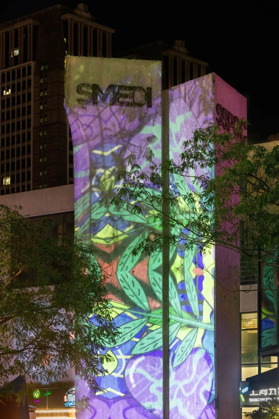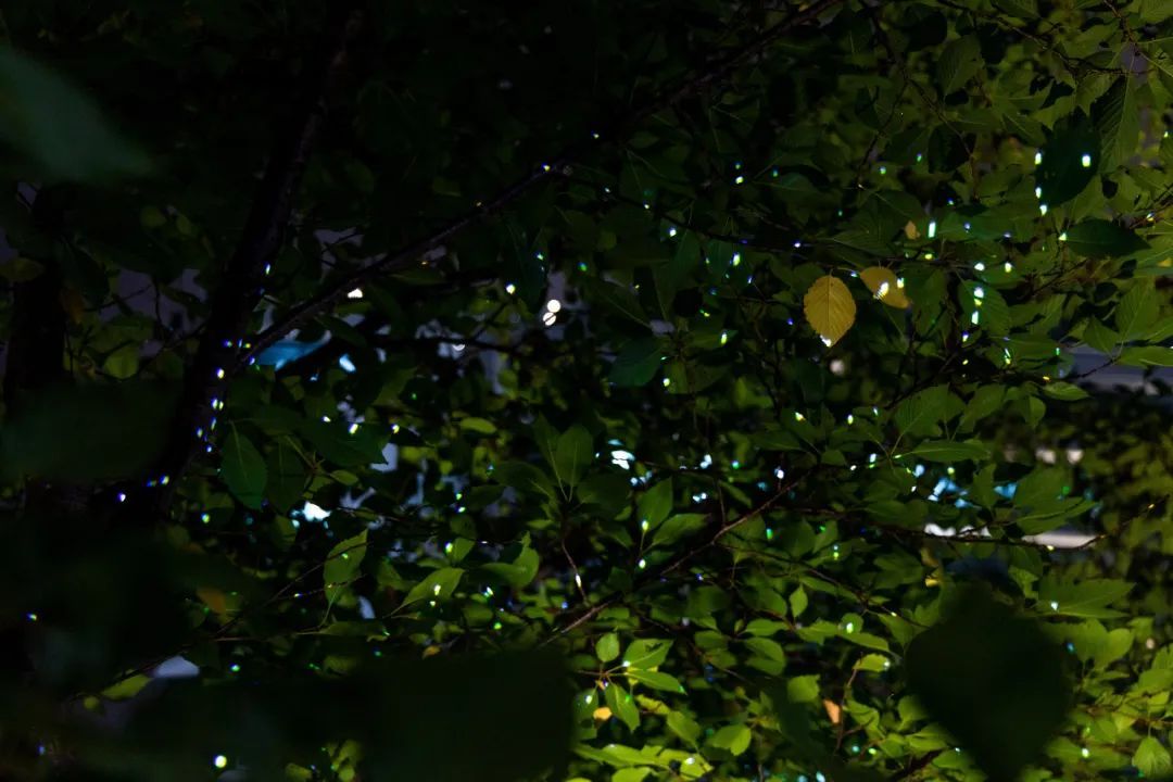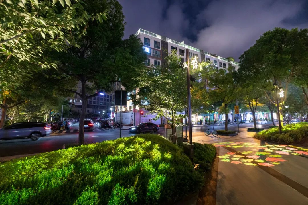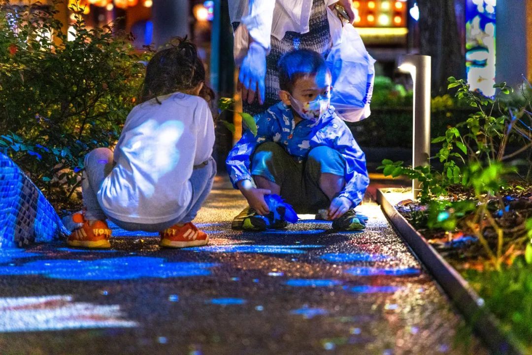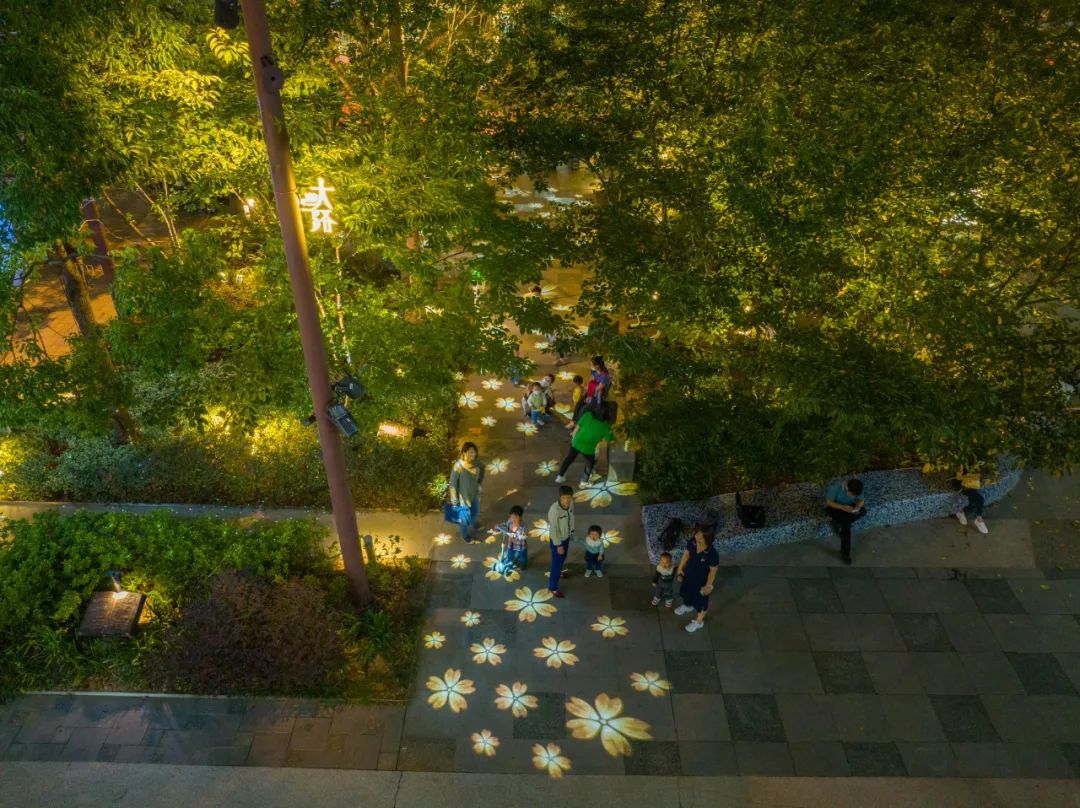 云海广场是整个大学路社区属性的核心。通过投影,这里的树冠、小径、叶片,都成为萤火虫与花朵栖落的“林间秘境”。华灯初上,老人来这里漫步,在“夜樱”中舒活筋骨;马赛克灯光效果下的林间长凳上,年轻人在摇曳的萤光中浅浅诉说彼此的心事;孩童们则在星星点点中愉快玩耍。