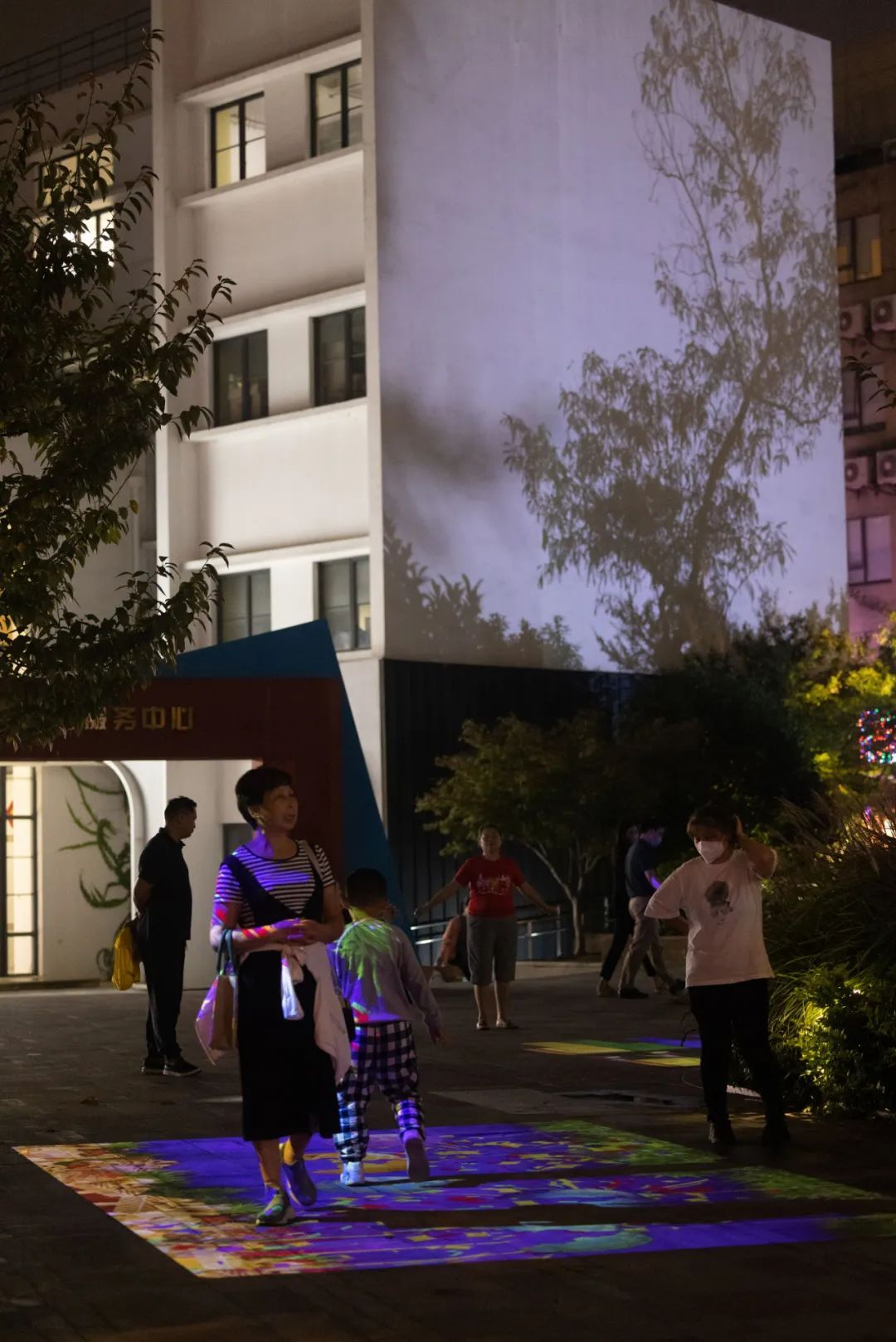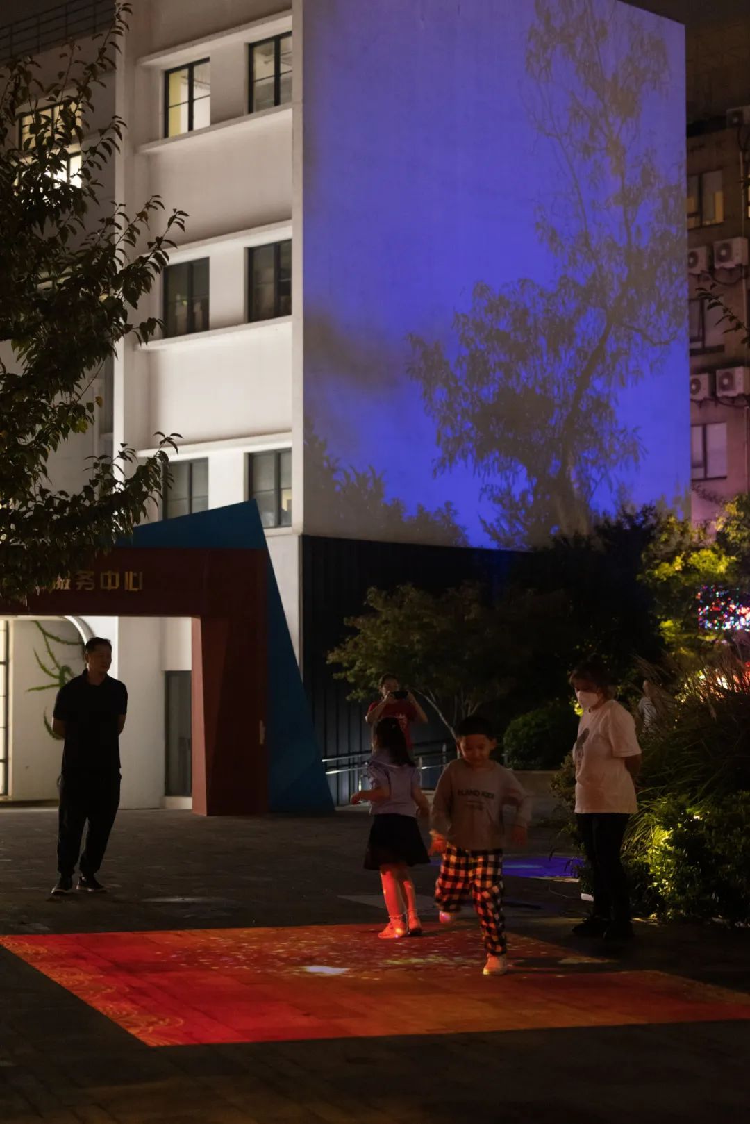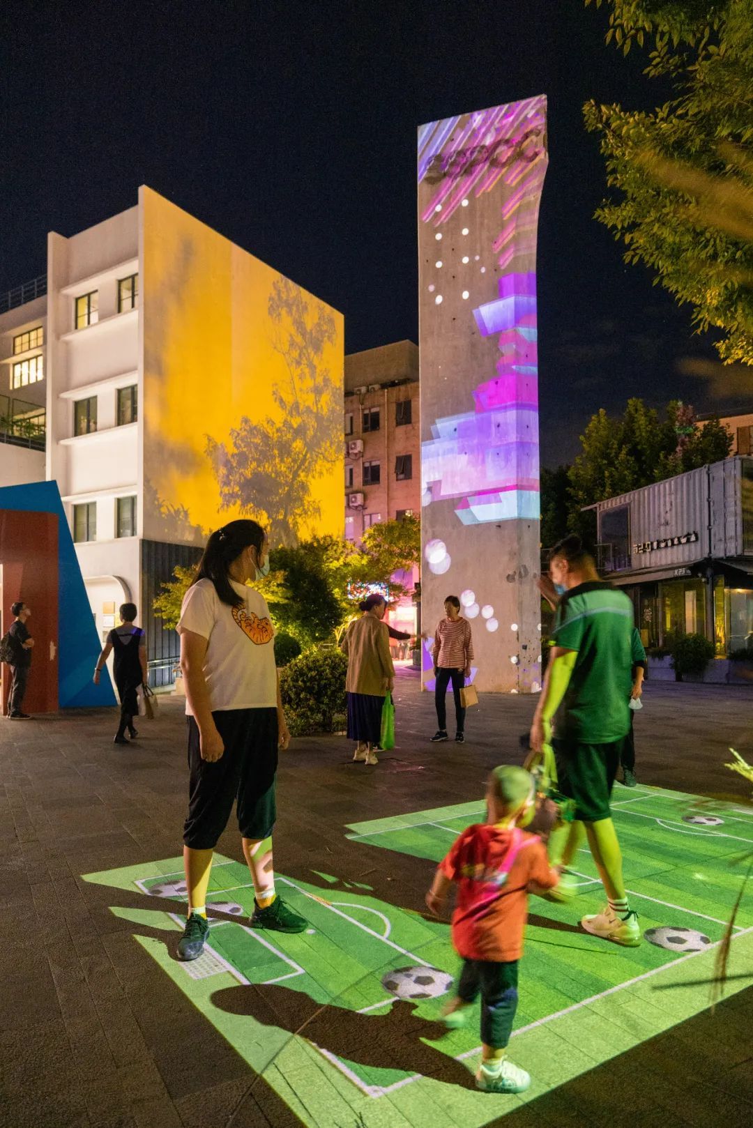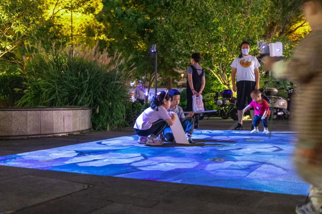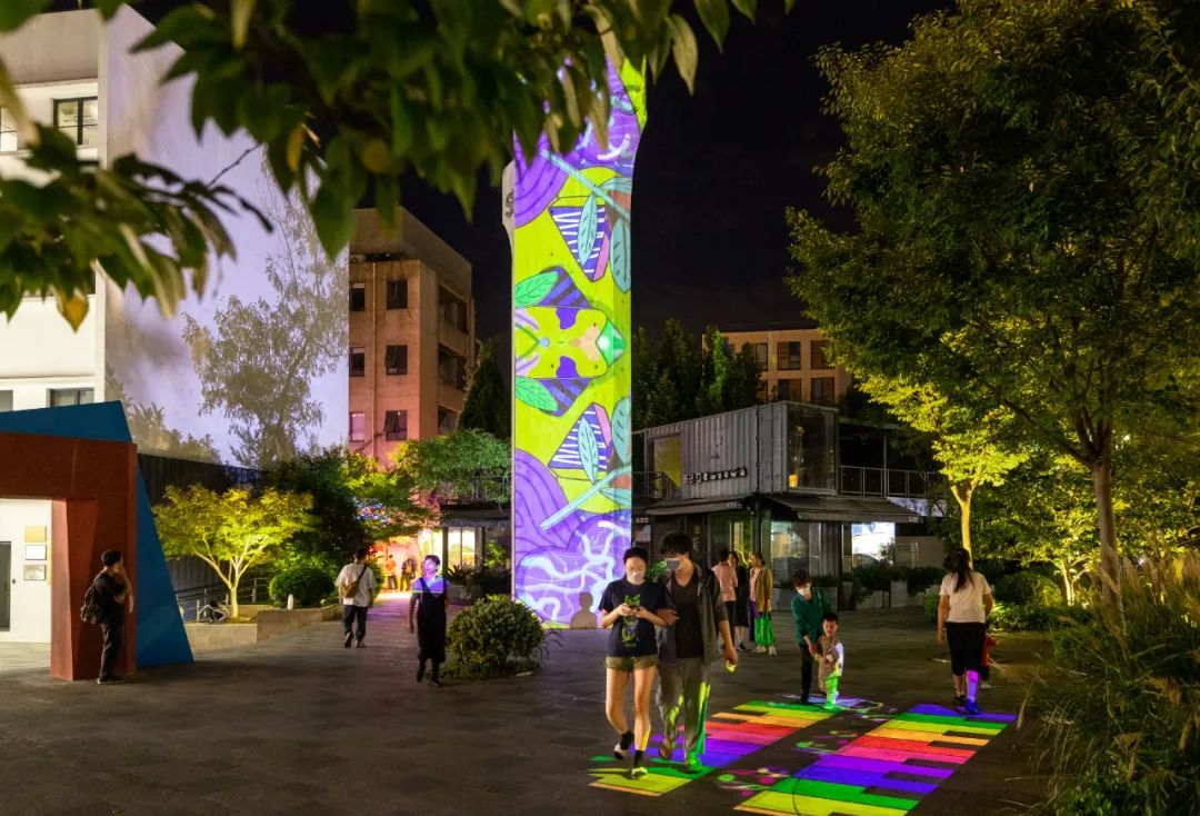 双创广场原有建筑已成为夜晚的“明星”,伴随着新鲜轻快的音乐,高达20米的巨构高塔上跳动起无数代表年轻视觉的缤纷元素。爸爸妈妈纷纷举着手机,记录宝贝跟着音乐在互动“七巧板”上的快乐起舞。