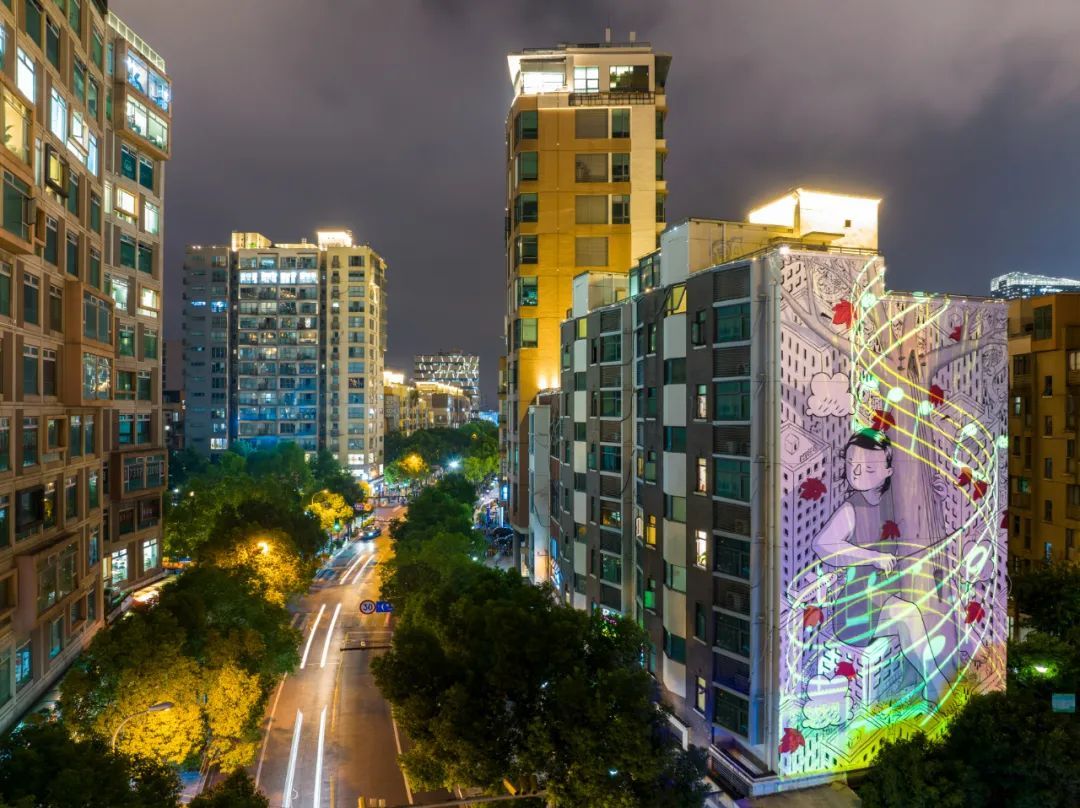 夜晚,艺术家在墙上描绘的诗意场景瞬间灵动起来。窗口的童话故事染上一抹温馨而暖意的光,拉着自然之琴的女孩仿佛在落叶、雪花、流星中弹奏。附近社区的居民坐在温暖的家中,开启一段音乐,看着窗外的动人景象,耳旁的旋律似乎也更加动人。