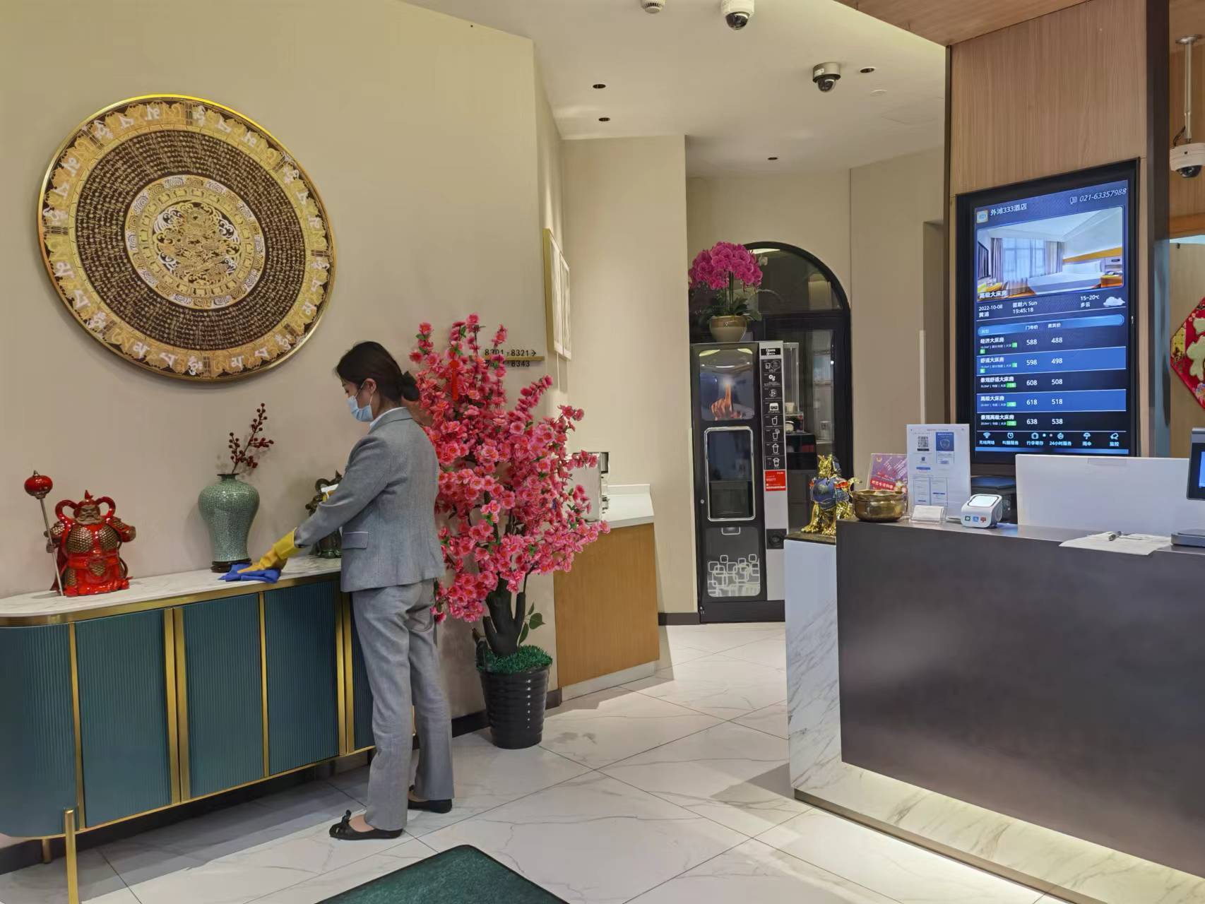 同时,为给宾客提供一个放心的入住环境,酒店客房在每日日常清洁后对房间地板、家具等喷洒消毒剂进行全方面消毒,并对高频接触物品使用75%酒精棉进行重点消毒。酒店大堂,电梯及其它公共区域每日定频使用消毒剂进行消毒。