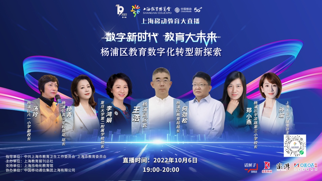 杨浦区副区长王浩、杨浦区教育局局长何劲松、复旦大学第二附属学校校长李鸿娟、杨浦区青少年科技站站长孙青、杨浦区平凉路第三小学校长郑小燕、杨浦区六一小学副校长汤玲做客直播间,与主持人一起畅谈杨浦教育数字化转型的探索与实践。