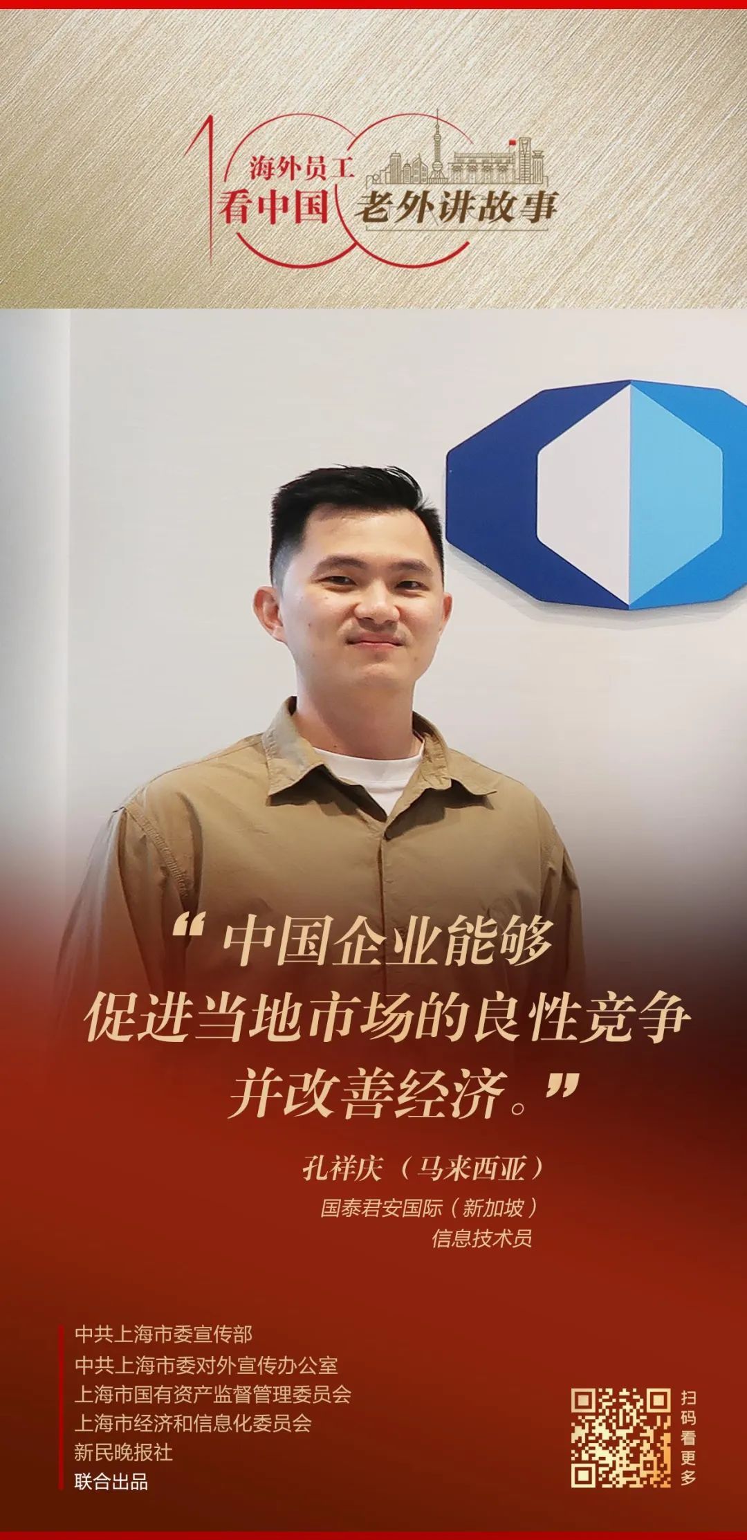 由中共上海市委宣传部、中共上海市委对外宣传办公室、上海市国有资产监督管理委员会、上海市经济和信息化委员会、新民晚报社联合出品的《老外讲故事•海外员工看中国》百集融媒体产品最新推出32-34期内容,国泰君安国际(新加坡)信息技术员孔祥庆、中国船舶集团国际工程(孟加拉)有限公司现场土建工程师浩克、上汽集团中东分公司公关经理劳拉·萨伦斯讲述自己身处中国企业、观察中国的真实感受。