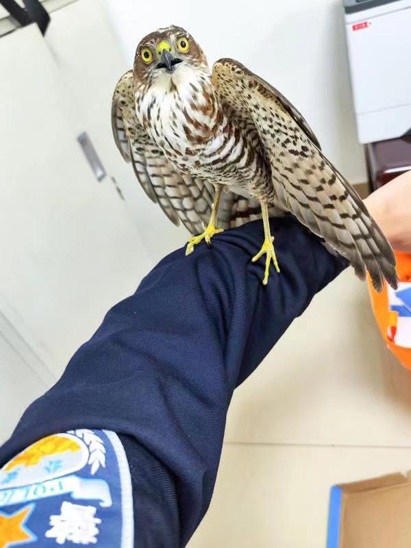 10月9日,崇明公安分局东旺派出所在辖区内救助一只国家二级保护动物游隼,并将游隼送到崇明区林业站进行医治,待其恢复后再放回大自然。
