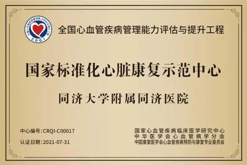 是CDQI国家标准化心脏康复示范中心,全国首批国家心脏康复中心培训示范基地 。中国康复医学会专科培训基地 ,上海康复医学会心脏康复培训基地(唯一),中国康复医学会心血管病专业委员会副主委单位,中国医师协会康复医师分会心脏康复专业委员会副主委单位,上海康复医学会副会长单位,上海康复医学会心脏康复专业委员会主任委员单位。