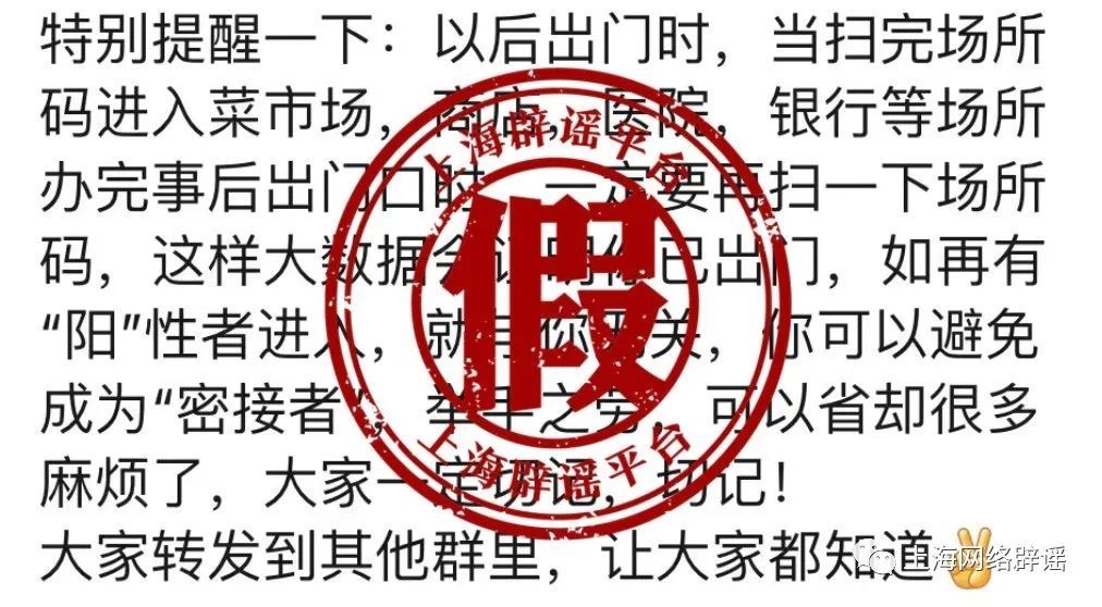 近日,在微信群里流传着一则“特别提醒”:“进入菜市场、商店、医院、银行等场所办完事后出门时,一定要再扫一下‘场所码’,这样大数据就会证明你已出门,如果再有阳性病例进入就与你无关,可以避免成为密接者……大家一定要转发!”对此,上海辟谣平台向上海市大数据中心相关工作人员求证获知,网传说法为不实信息。出门时再次扫描“场所码”,并没有“证明出门”的作用,对于密接人员的判定还是需要根据疾控等相关部门的流调来确认。