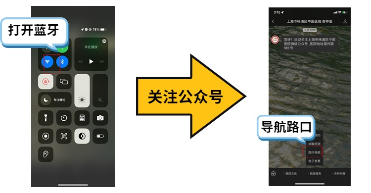 打开手机蓝牙功能,扫码关注“上海市杨浦区中医医院”微信公众号,点选“就医服务”中“院内导航”。