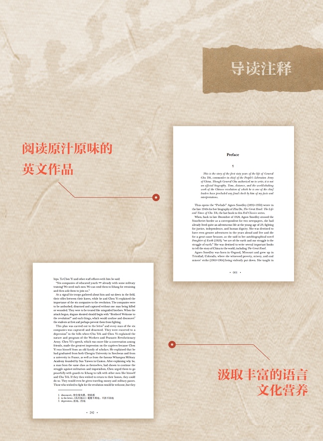 扬州大学特聘教授祁寿华撰写英文导读,外语学界各资深学者作注,或勘误原文、注解生词,或补充相关历史背景知识,以扫清阅读障碍,使各个年龄阶段、不同外语水平的读者均能流畅品读原汁原味的英文“红色”原典。