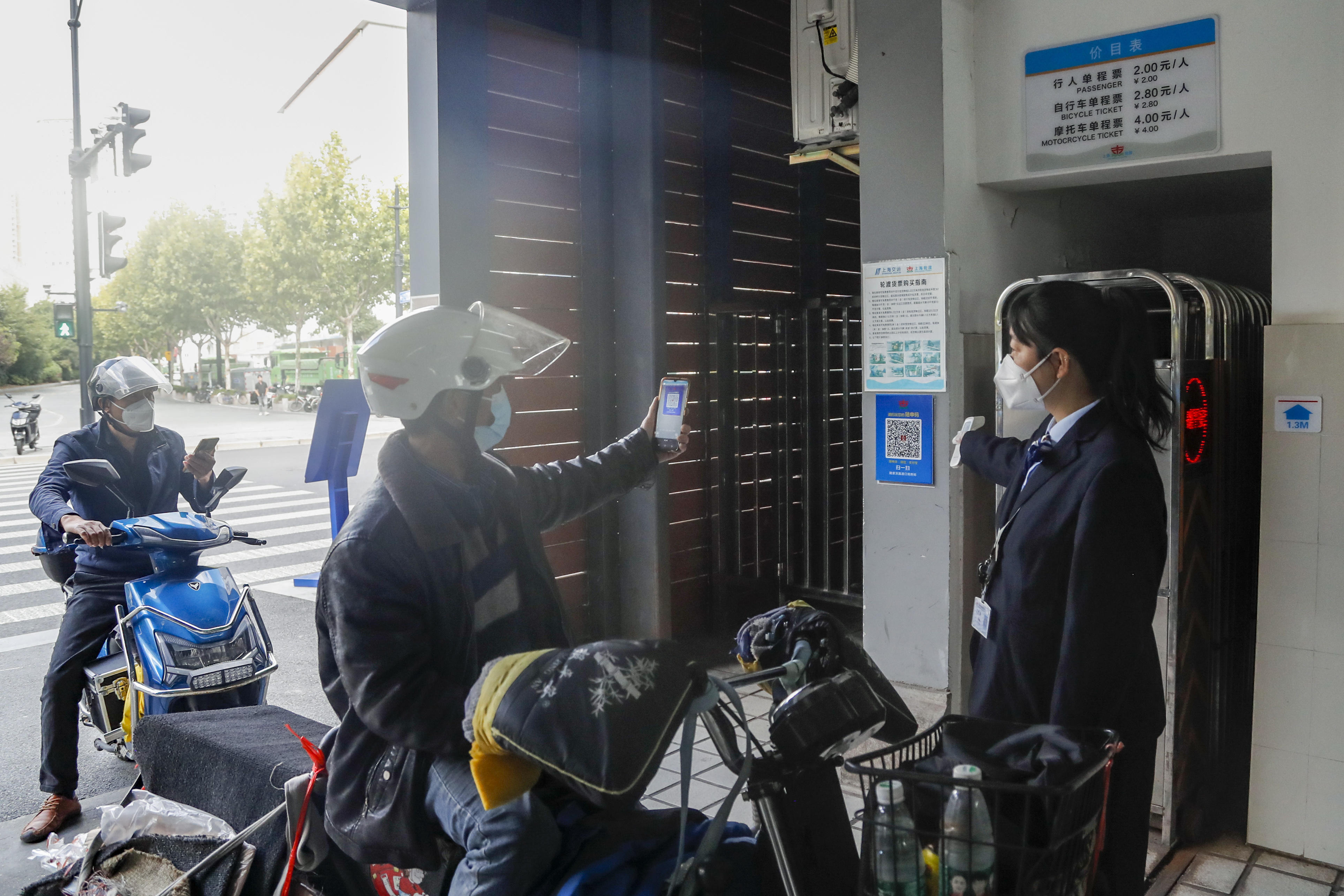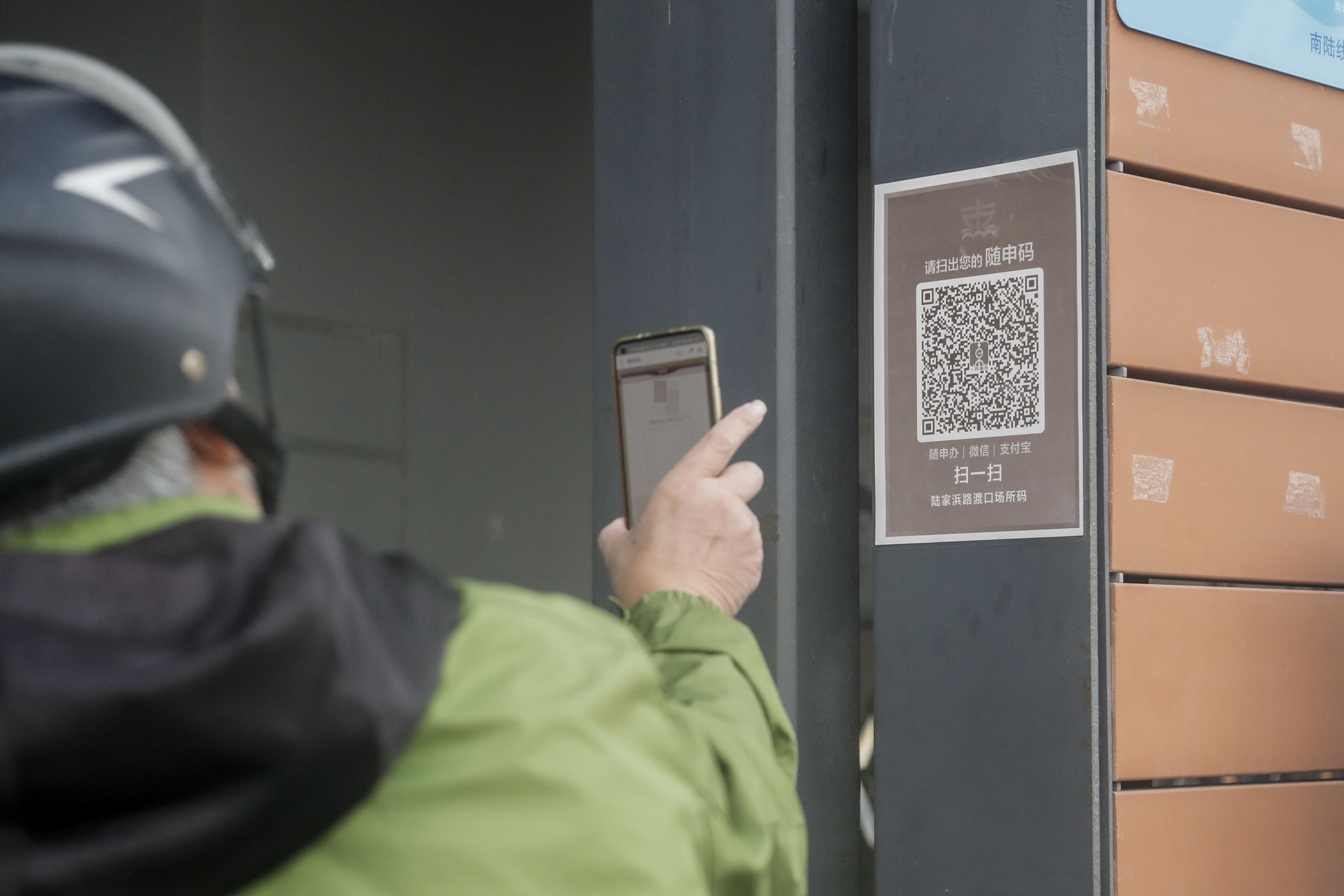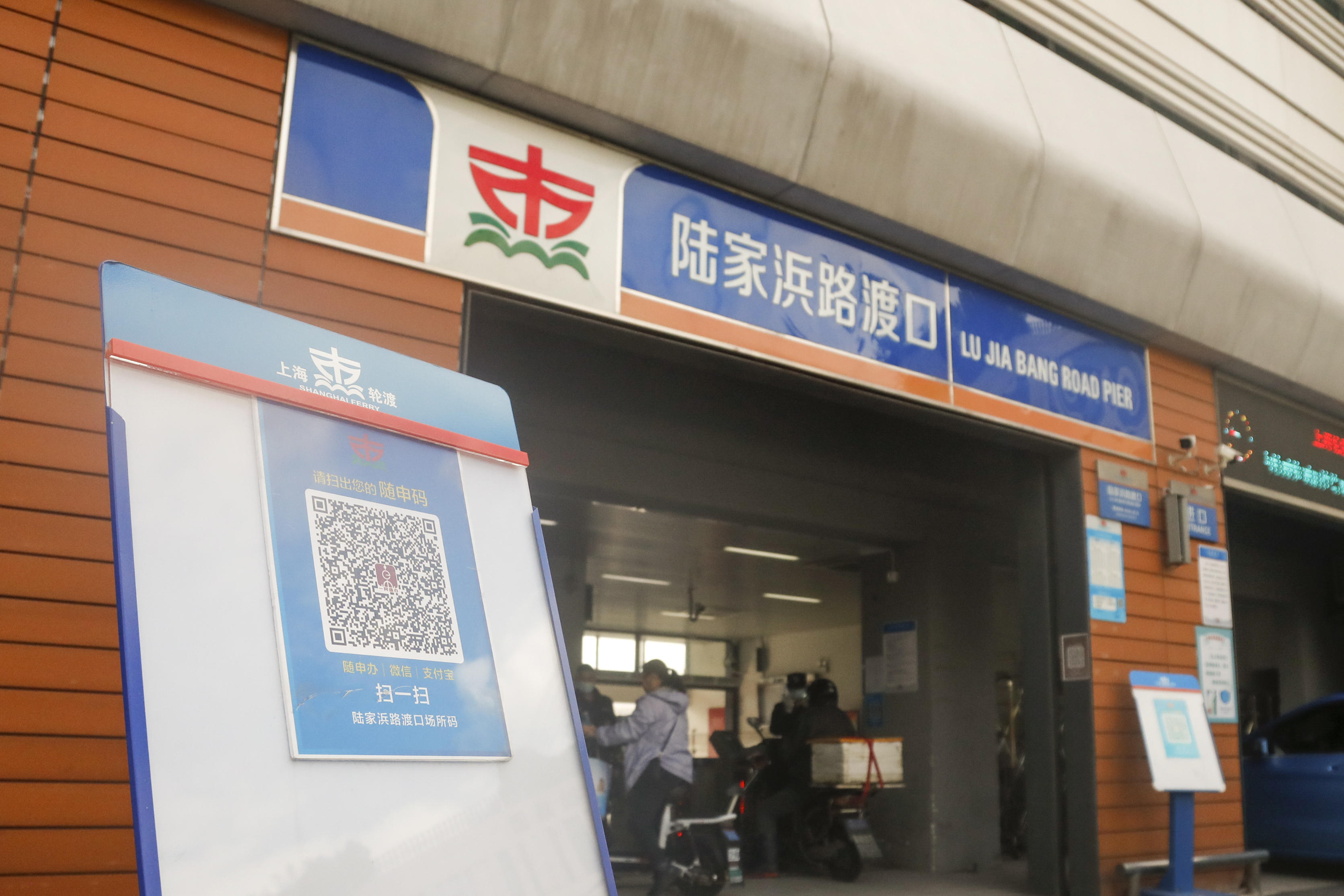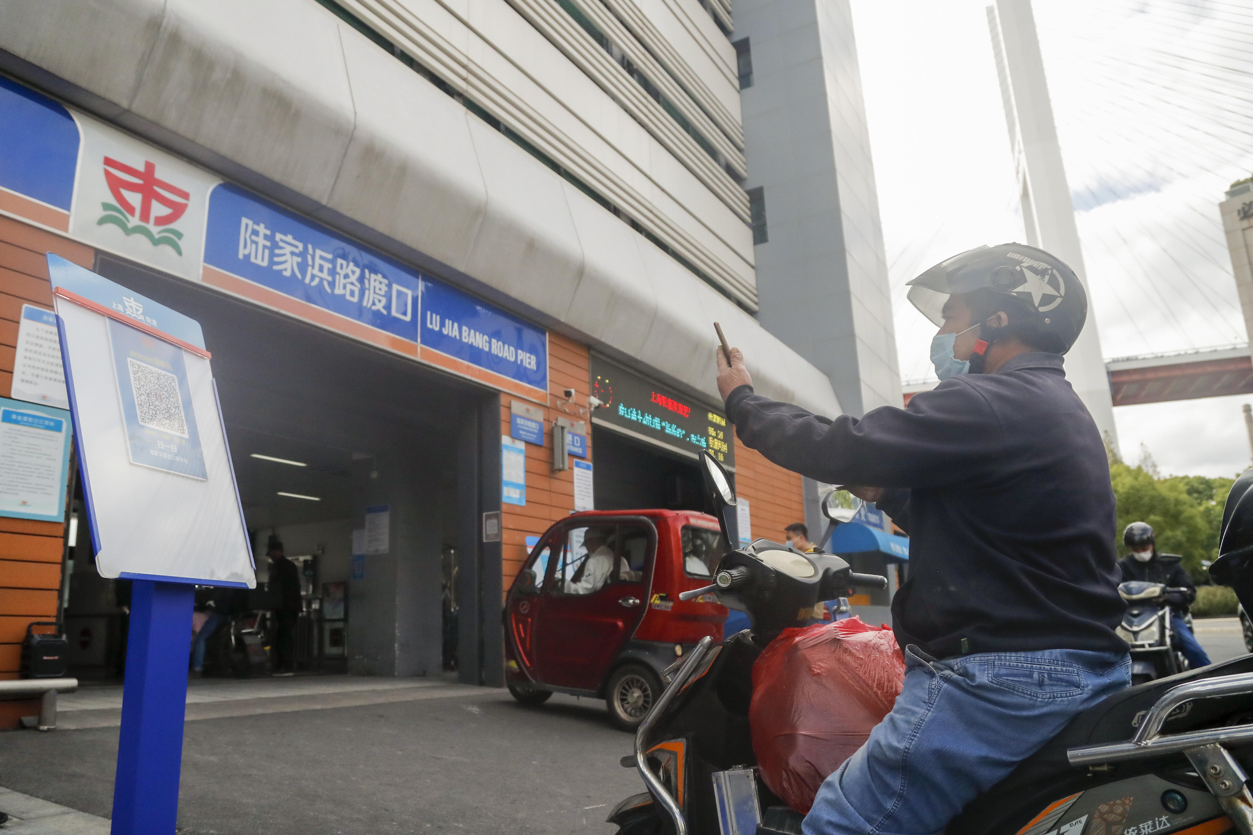 “进站请扫场所码,谢谢配合,进站请扫……”在位于外马路1279号的陆家浜路渡口进口处,小喇叭重复播放着防疫宣传口号。