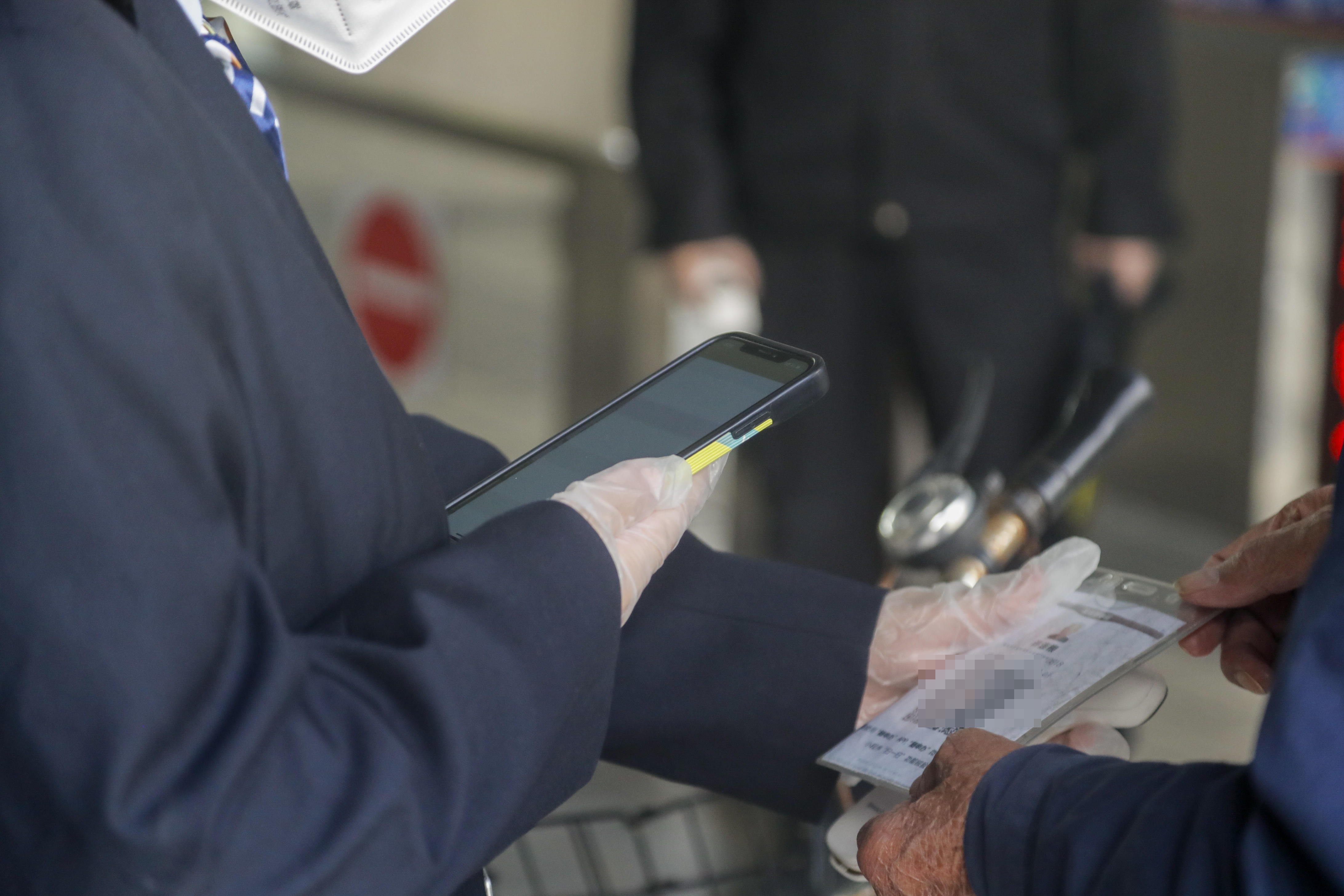 通常来说,稍年长的顾客都不擅长使用智能手机,此时现场的工作人员均会上前引导其使用,如遇到没带手机的情况,也可通过登记身份证核验其随申码信息。