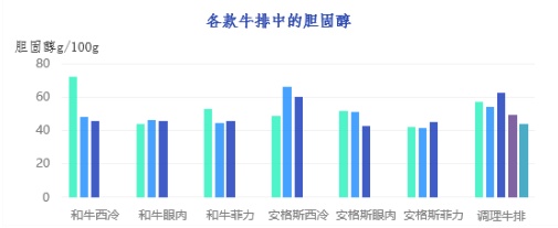 人一日膳食中胆固醇摄入总量不宜超过300mg。试验发现,原切牛排和调理牛排的胆固醇含量差异不大,都是胆固醇含量较低的肉制品,测试平均值分别50mg/100g 和54mg/100g。