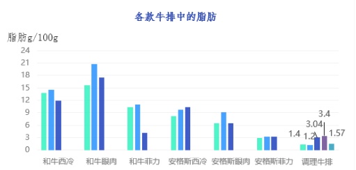 2、不同品种、不同部位的牛排脂肪含量差异明显