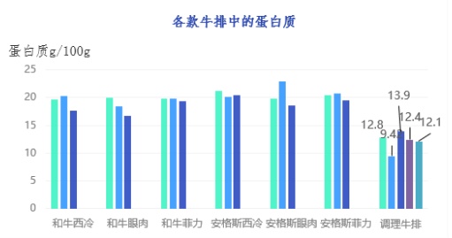 测试发现,原切牛排蛋白质含量在16.7-22.9 g/100g之间,平均含量约为20g/100g,不同牛种、不同部位含量差异不大,均富含蛋白质;调理牛排蛋白质含量在9.42-13.9g/100g之间,平均含量约为12.1g/100g,大致为原切牛排的60%。