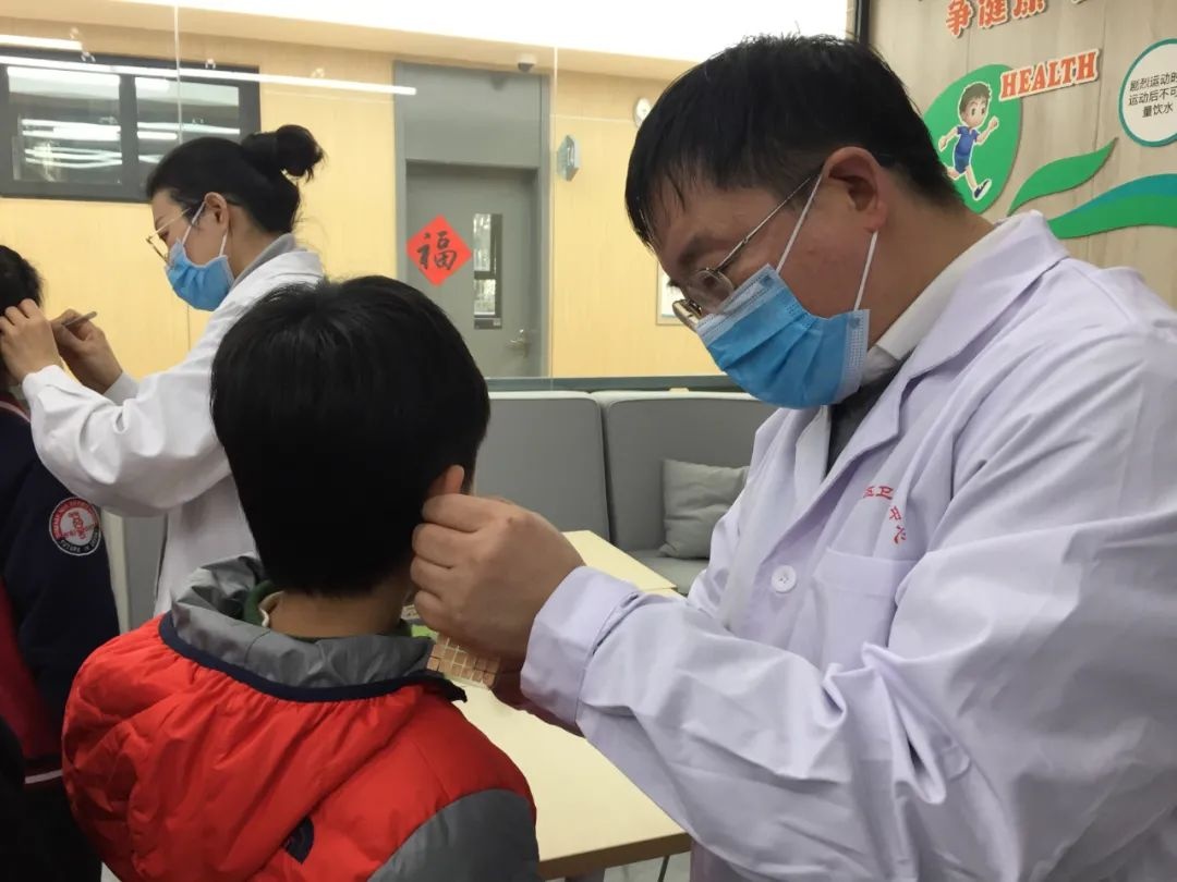 “我们嘱咐学生,每天要按压穴位2到3次,手法由轻渐重,下一周换另一只耳朵贴敷,以此对近视起到预防的作用。”华阳街道社区卫生服务中心医生石向东介绍。