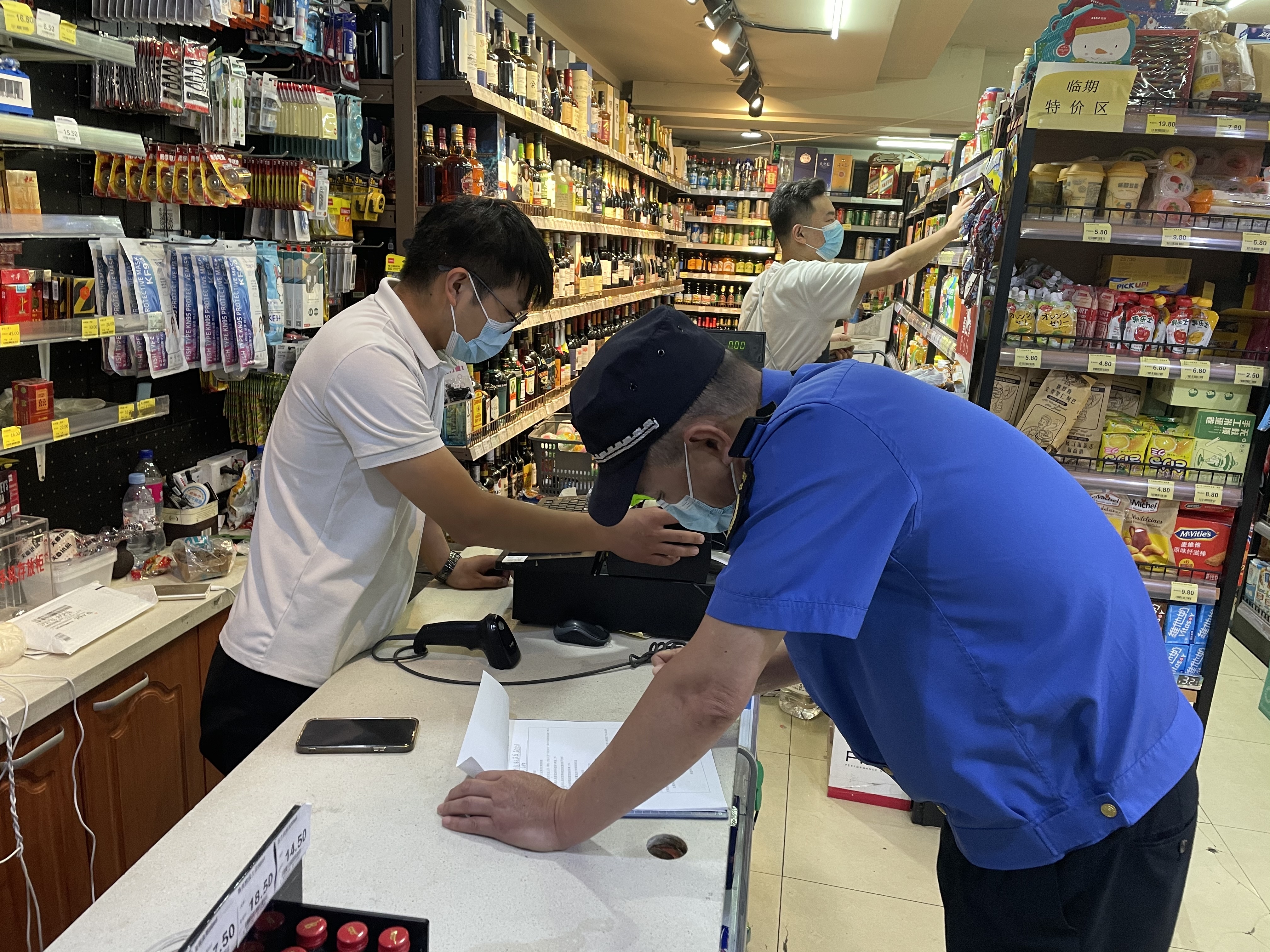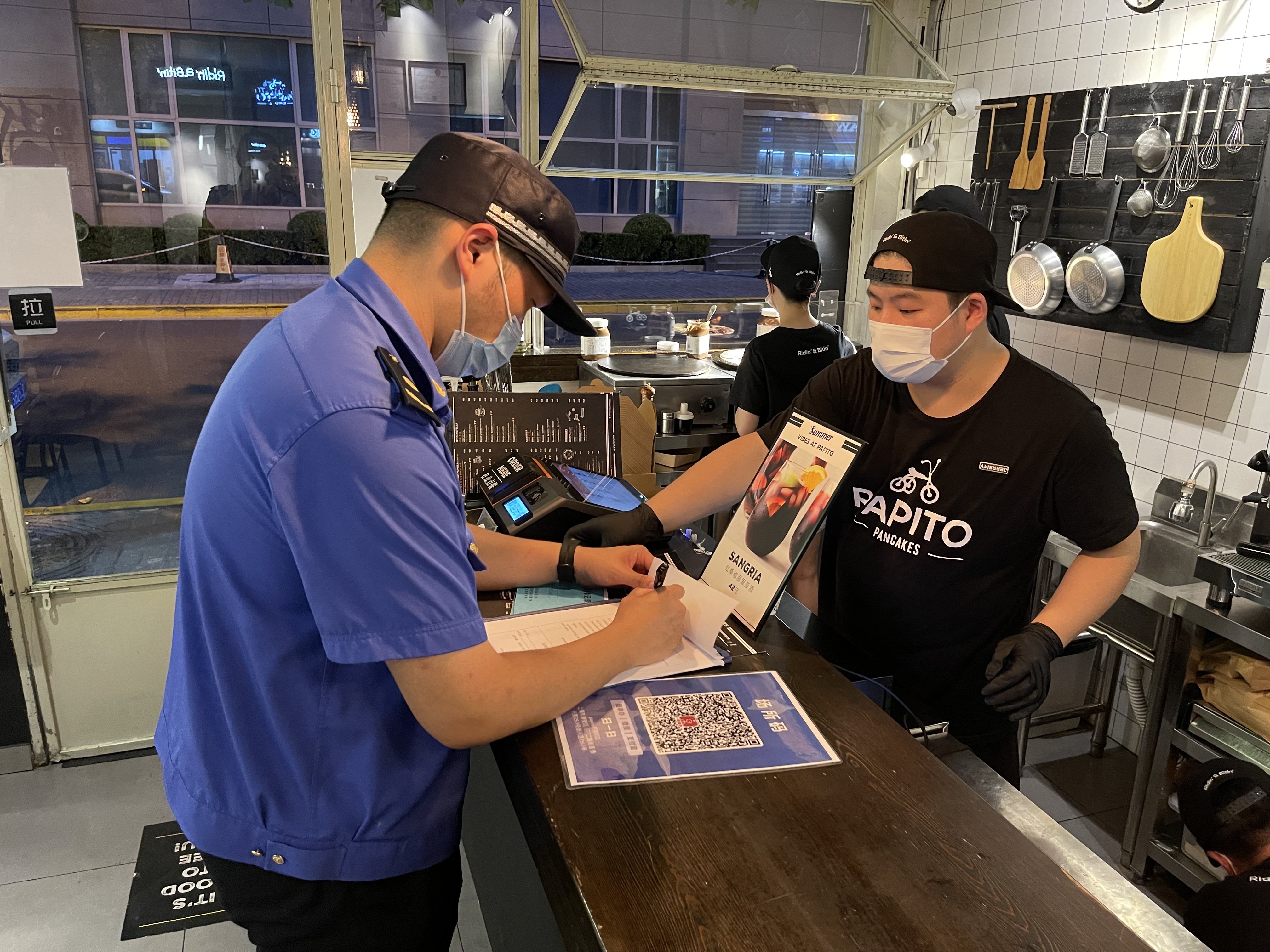 中队执法人员在沿街商铺的防疫巡查检查中,常规性检查场所码扫码验码情况、人员核酸情况等。针对检查中发现的员工未按照本行业要求定期做核酸,落实从业人员、顾客、外卖人员“凡进必扫”要求扫场所码或数字哨兵,落实场所消毒工作等情况,中队执法人员开具整改通知单,要求当事人立即整改。