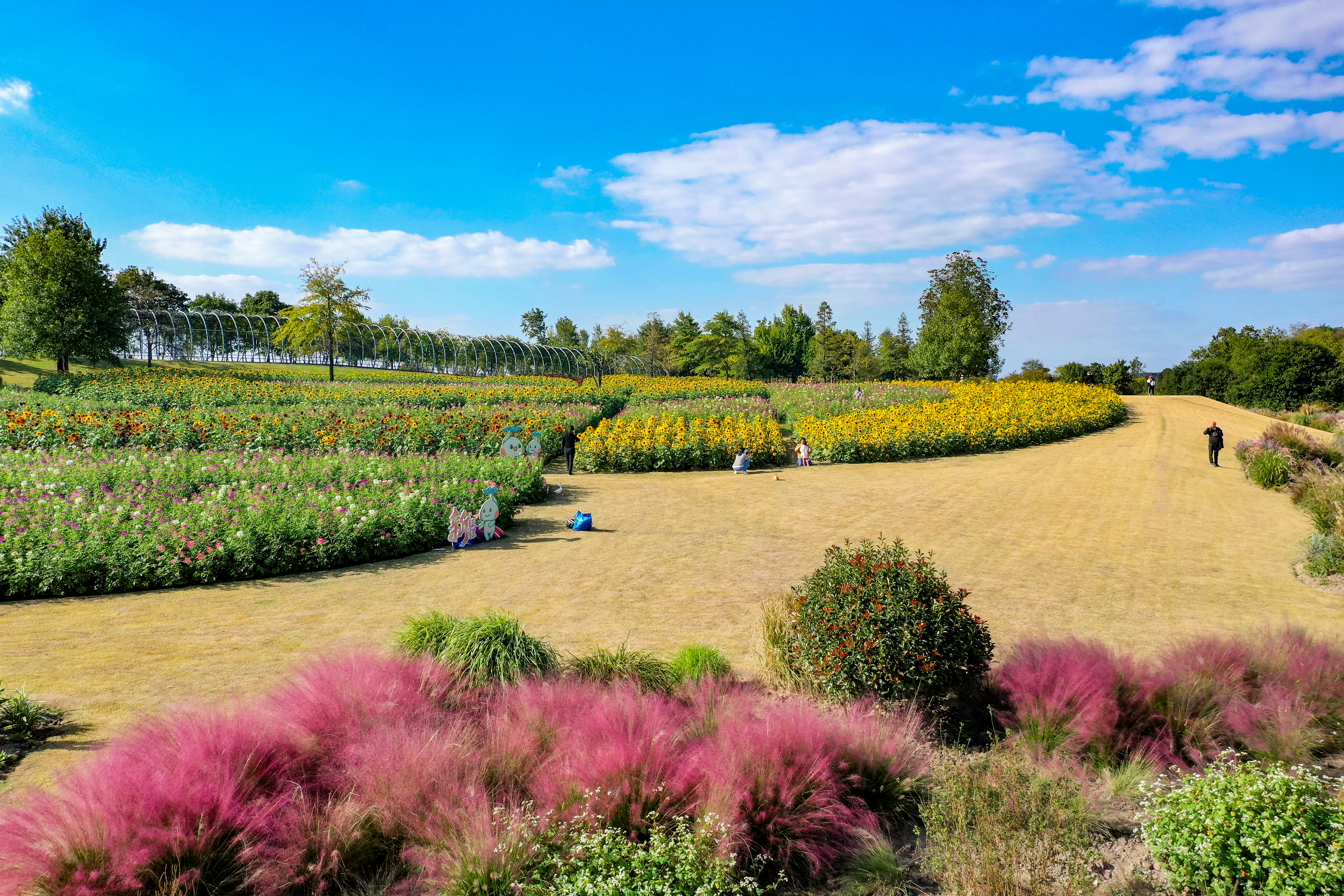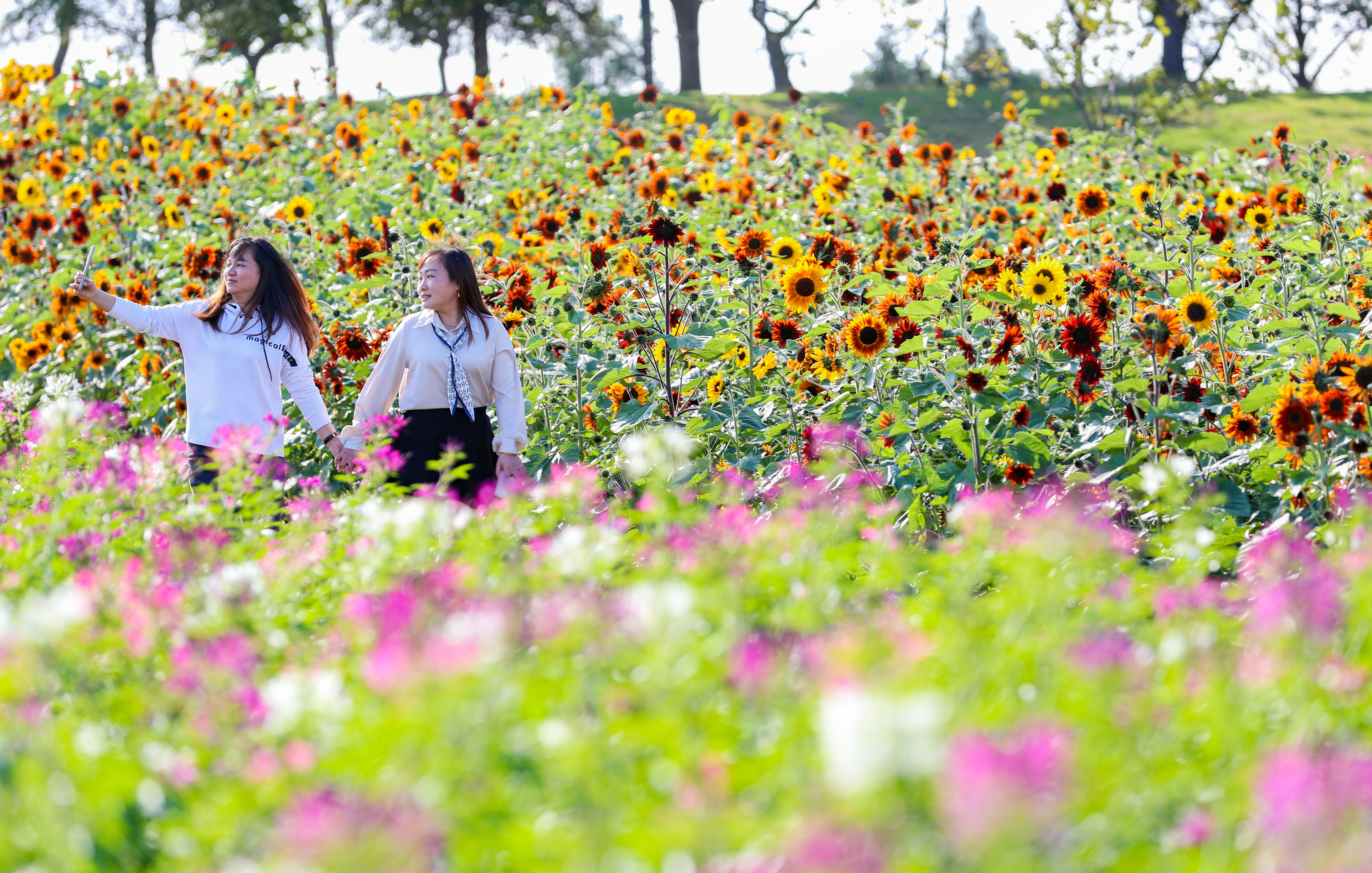 记者在现场看到,秋天的微风拂过,花海中漾起层层金色的花浪,沿着小路行走的游客正在体验穿越花海的快乐。花盘如同一张张笑脸般,迎着太阳肆意绽放,给微凉的秋日带来一丝丝温暖,而与向日葵一同绽放的醉蝶花,曼妙多姿,随手一拍便是风景图。