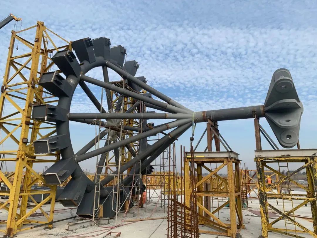 钢结构吊装过程中,项目建设指挥部根据现场施工条件,将钢结构在工厂分段散件加工,运输到项目现场后,就地拼装成吊装单元,设置临时支撑,以“临时支撑、现场拼装、分段吊装”的施工方式进行吊装作业,确保每一个吊装环节、施工步骤精准实施。